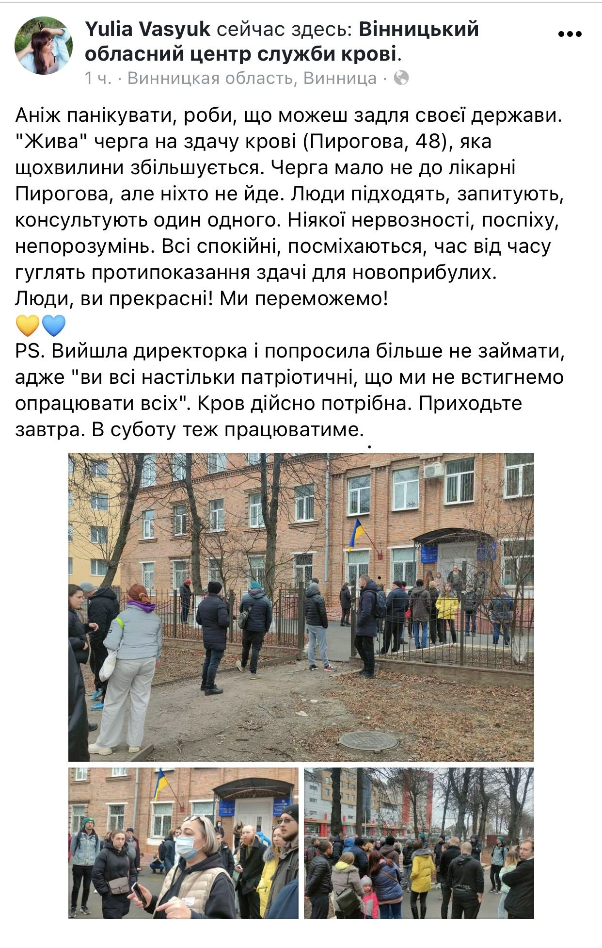 - О 12.00 на сторінці в фейсбуці обласний центр крові опублікував звернення до вінничан — «нам потрібні донори».