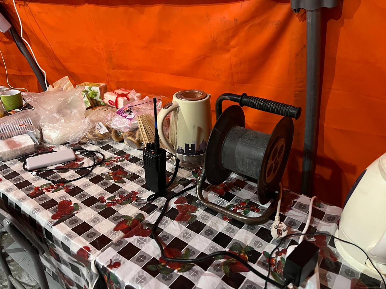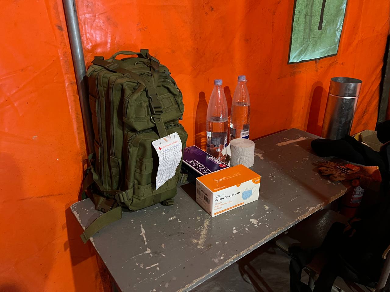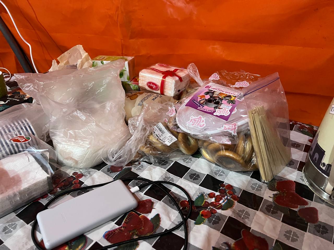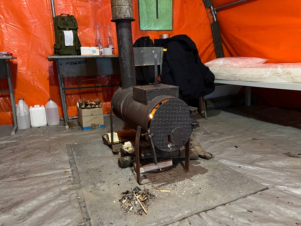 У мобільному наметі можна зігрітися, зарядити телефони та інші гаджети, випити чаю або кави. Тут є печиво, цукерки, столи для відпочинку. Облаштовані спальні місця — за потреби люди можуть навіть переночувати, якщо вдома немає опалення. Для цього є запас дров та піч.