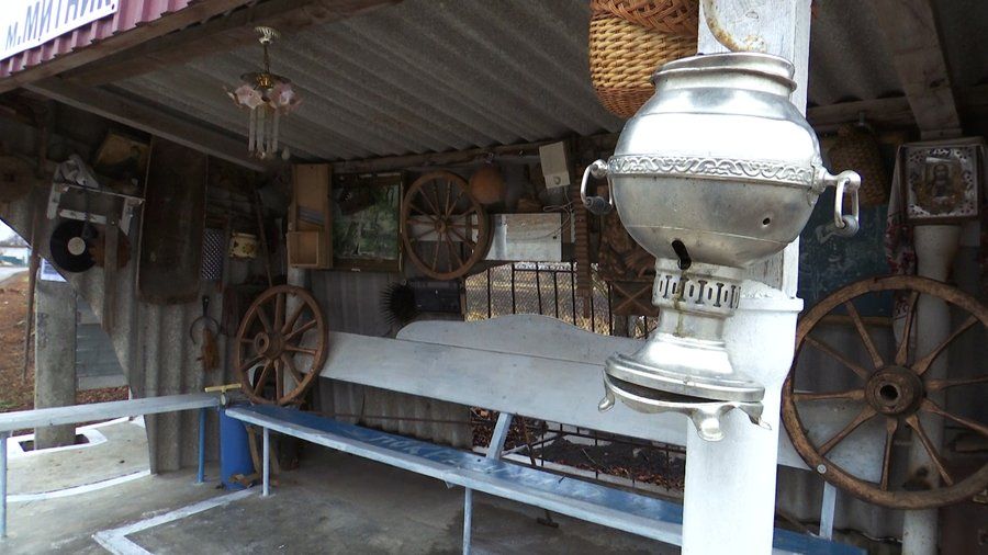Нині тут, як у музеї, є старі глечики, колеса від воза, музична платівка, гасовий ліхтар, металева праска, яку розігрівають вугіллям, а також дошка для прасування речей. В одному місці лежать два схожі предмети — кінська підкова і рогачі, з їх допомогою казани «садили» у піч і витягували з печі. Є два радіодинаміки, скляний бутель, обплетений лозою…