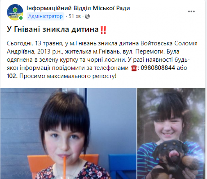 — Соломія Войтовська живе в місті Гнівань по вулиці Перемоги. Дівчинці вісім років, — йдеться у повідомленні.