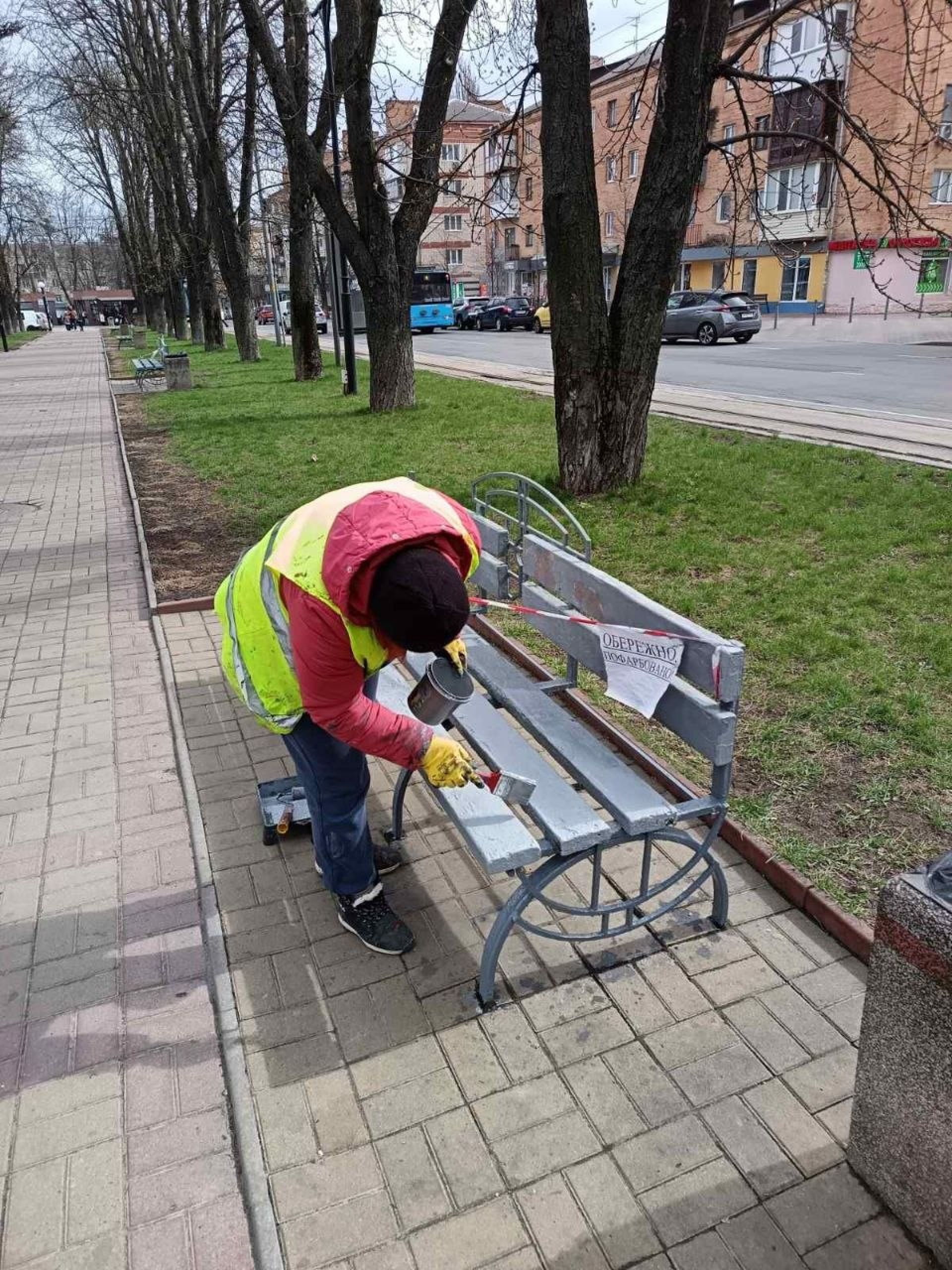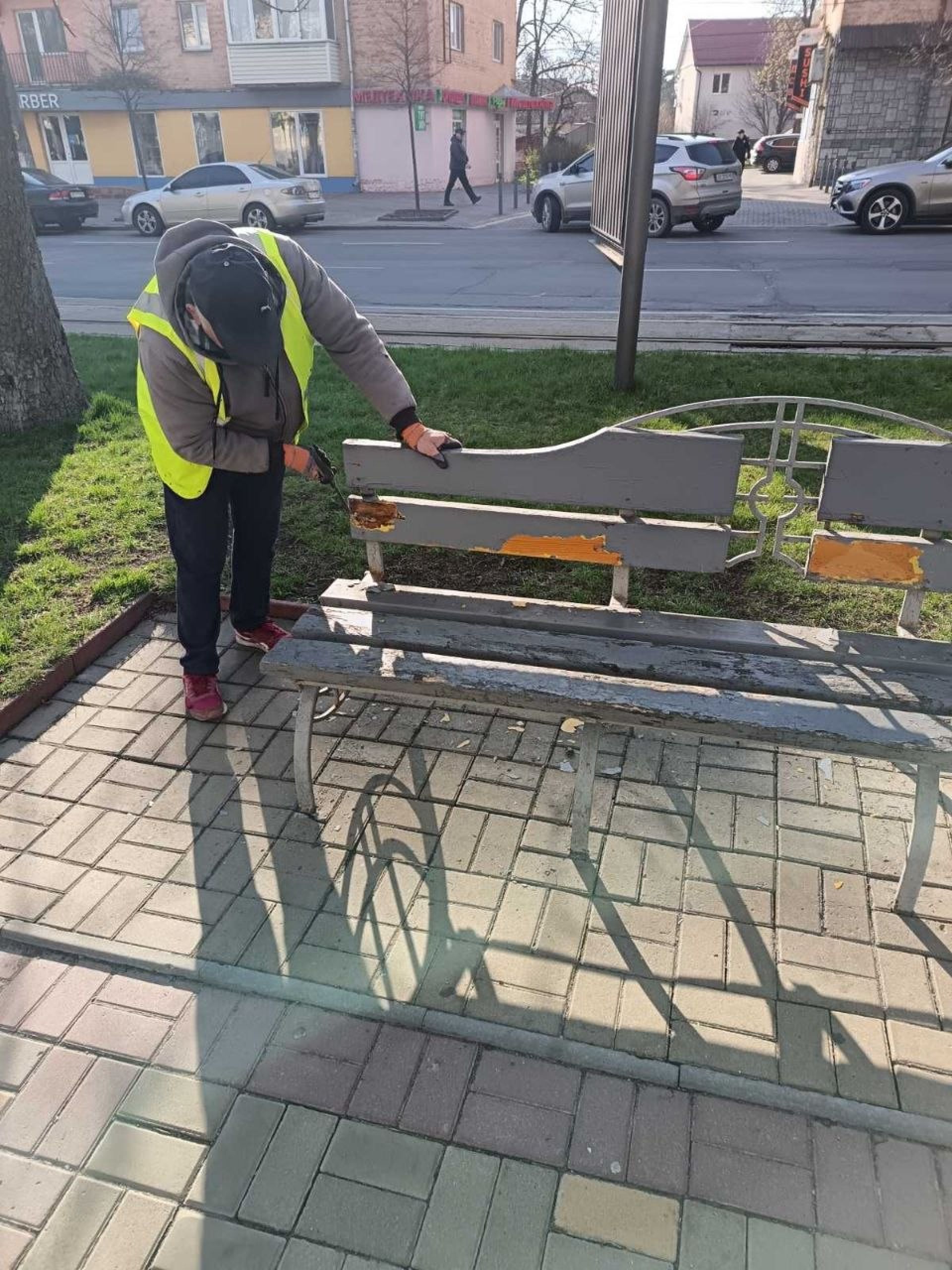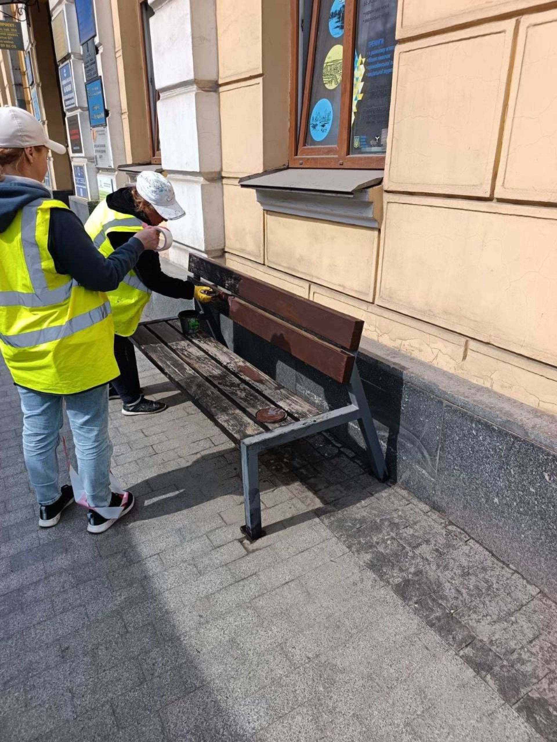 - Поки одні служби миють зупинки та чистять дороги, інші — дарують нове життя вуличним лавам, огородженням та антипаркувальним стовпчикам.