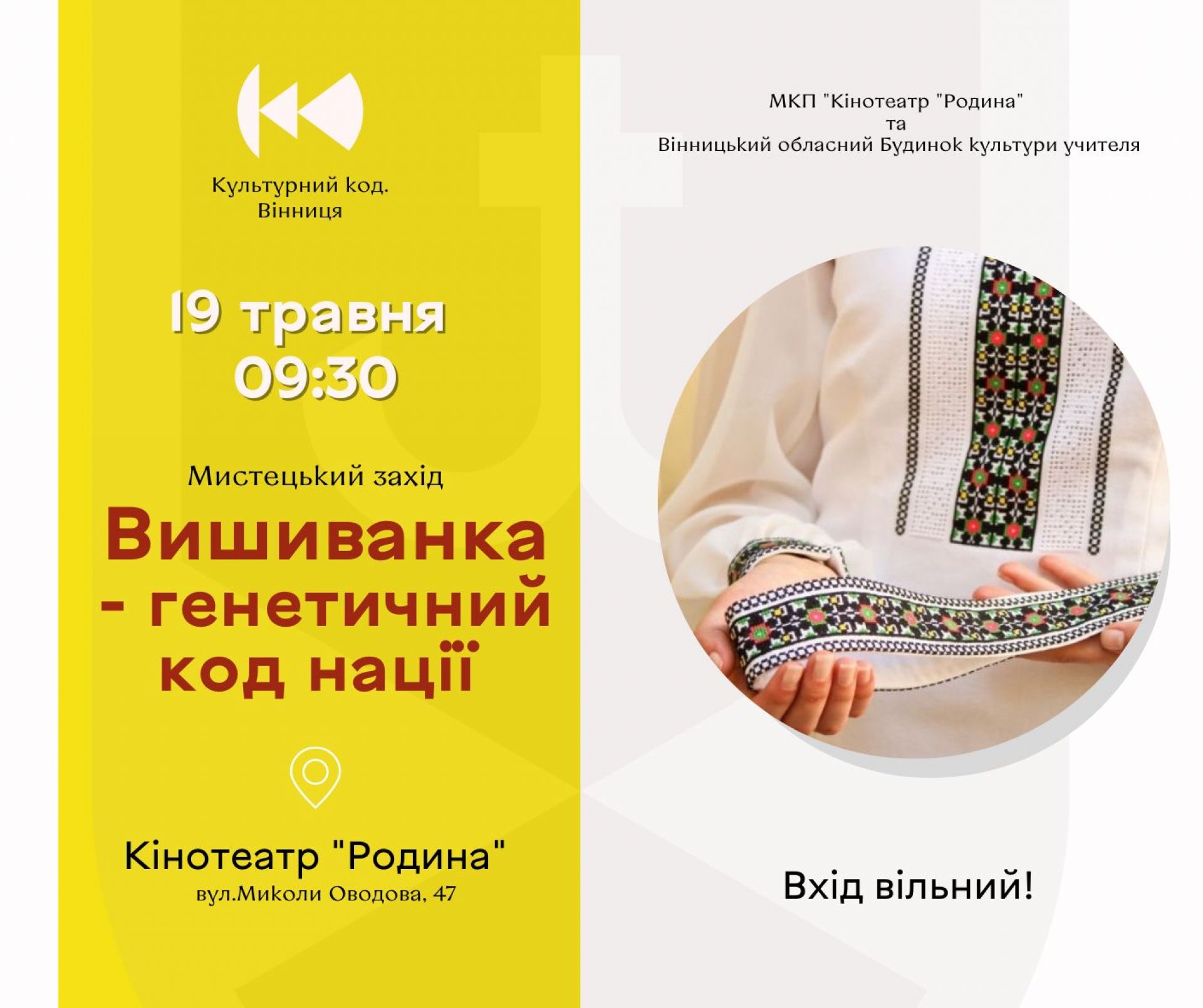 - Завтра, 19 травня, відзначають Всесвітній день вишиванки. З цієї нагоди кінотеатр Родина запрошує на мистецький захід «Вишиванка — генетичний код нації».