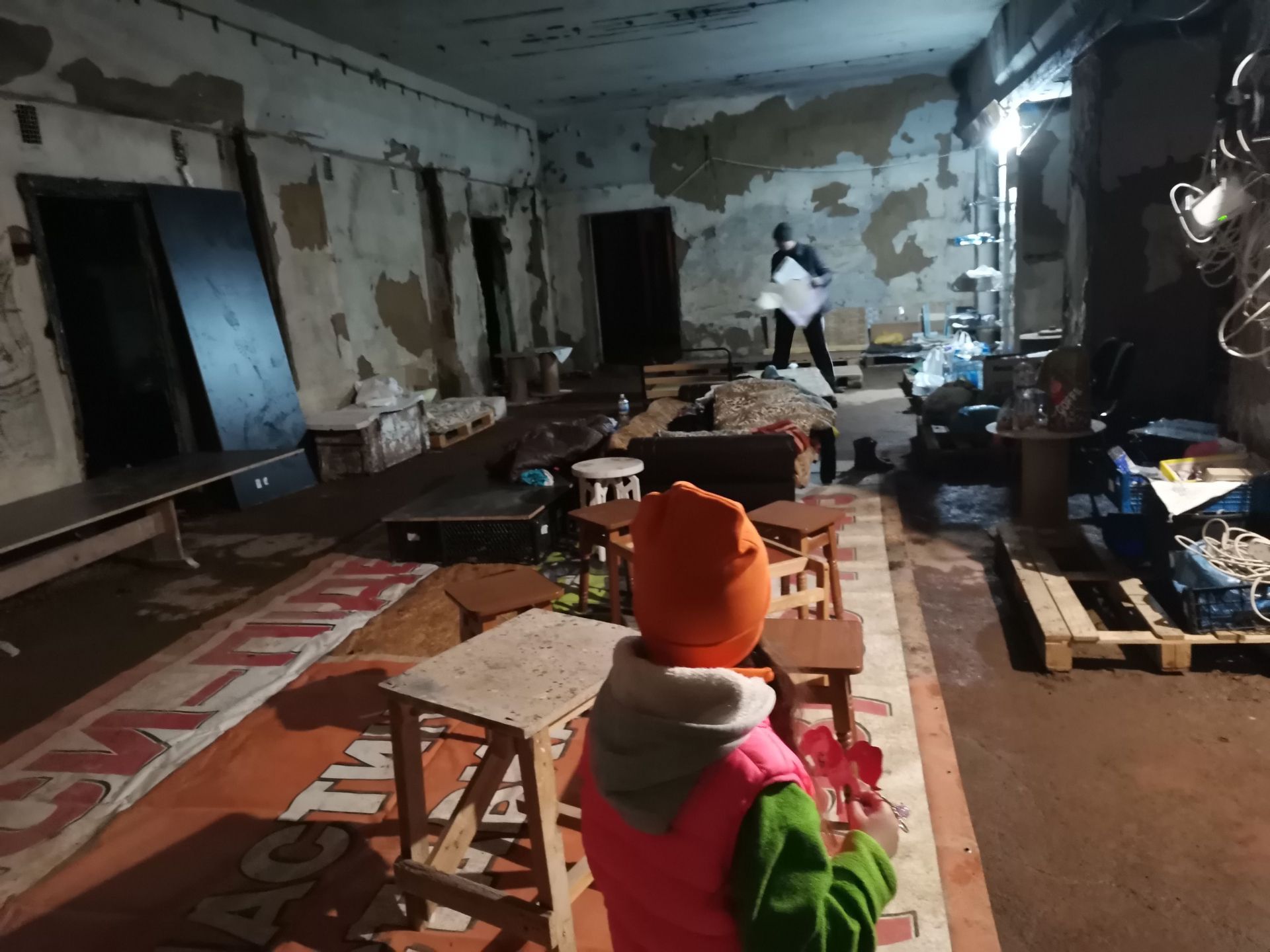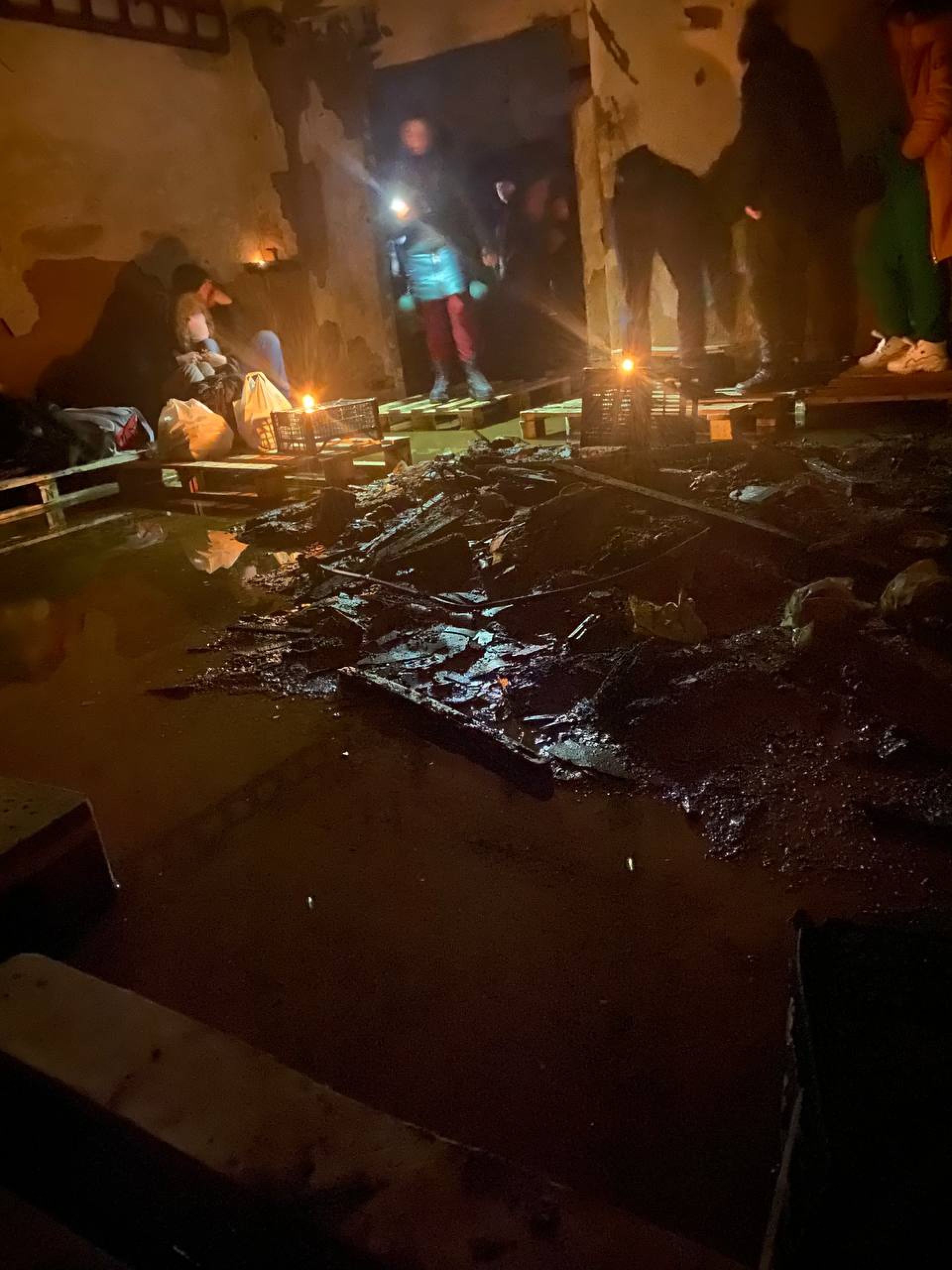 Перші дні та ночі мешканці проводили просто у воді, або ж «застеляли» затоплену підлогу піддонами. Спинами вони спиралися на пошарпані та вкриті цвіллю стіни. Повітря всередині було спертим, проте теплим, що дозволяло присутнім не замерзати у лютневі ночі. Освічували приміщення свічками, домашніми ліхтариками й телефонами.