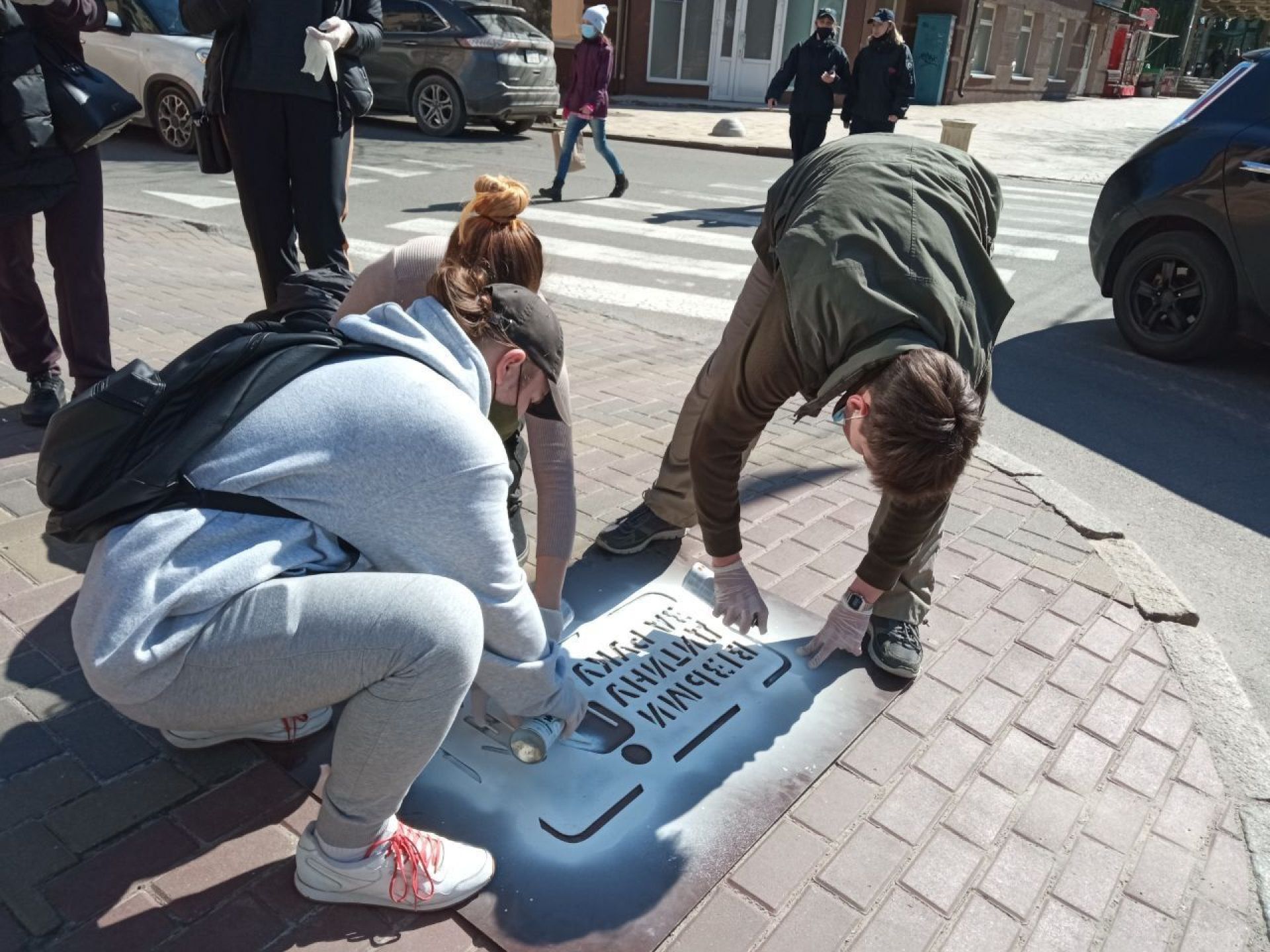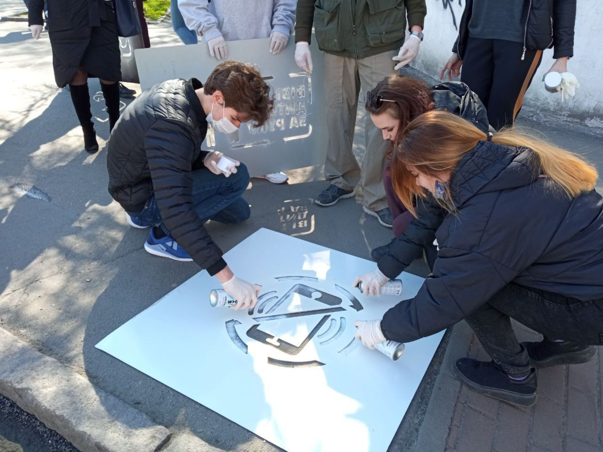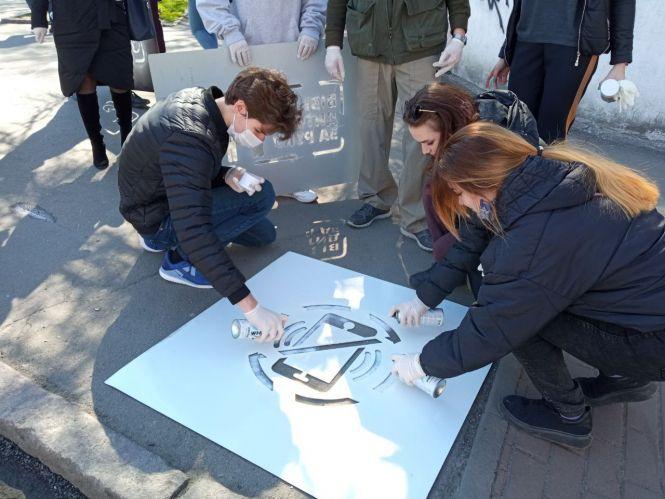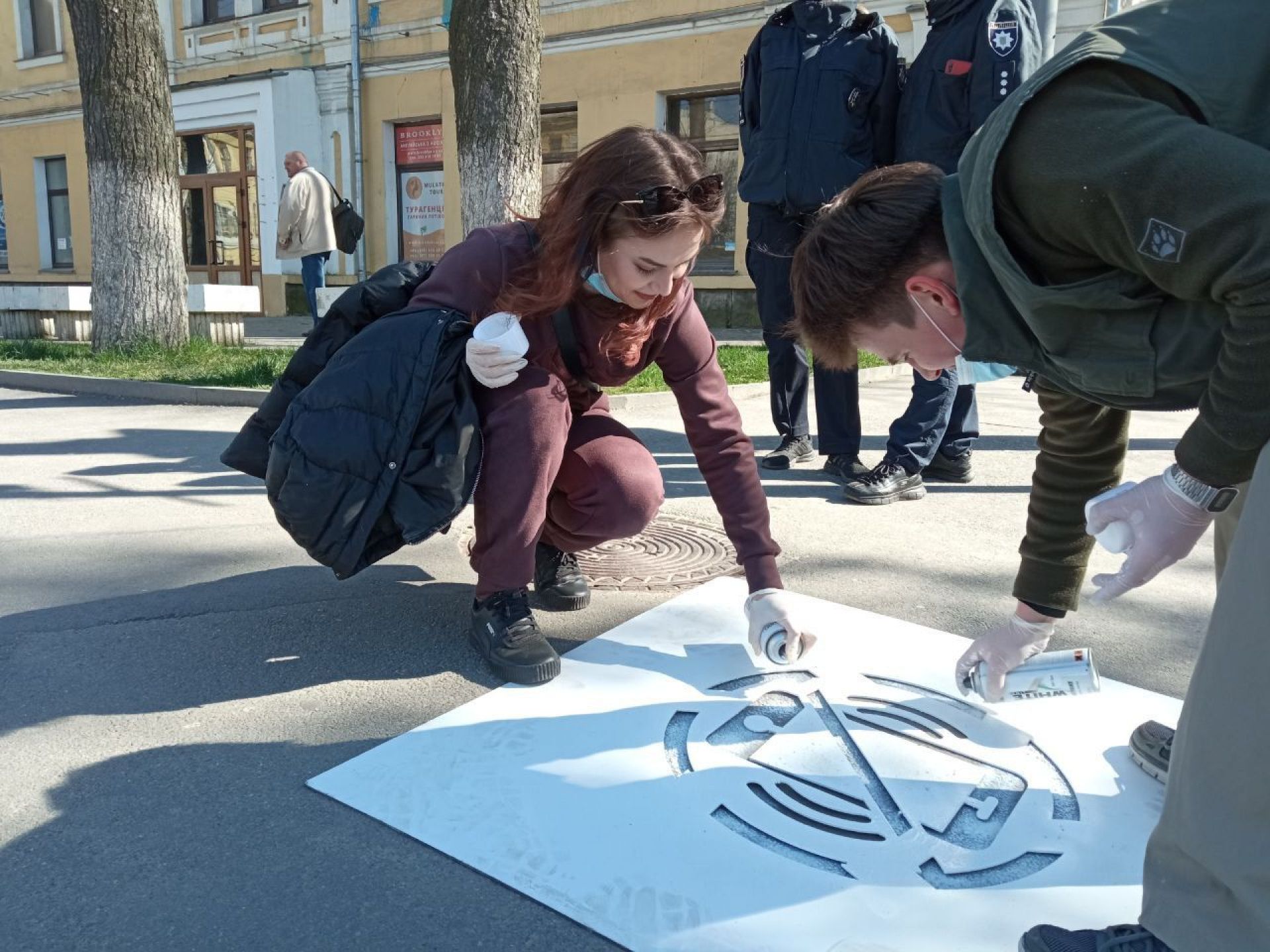 Загалом до заходу долучилися близько 10 молодих людей. Вони досить швидко почали замальовувати трафарети, паралельно відповідаючи на питання зацікавлених перехожих. Не всі люди розуміли, що саме роблять активісти, тому, проходячи повз, жваво перешіптувались між собою.