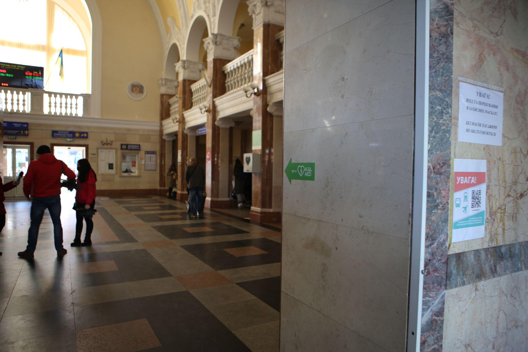 Далі ми поїхали на залізничний вокзал, де теж вже орієнтовно місяць тому встановили АЗД. Як тільки ви заходите у Центральний хол, праворуч можете його одразу ж побачити. Також до нього є вказівки, тому знайти АЗД не важко.