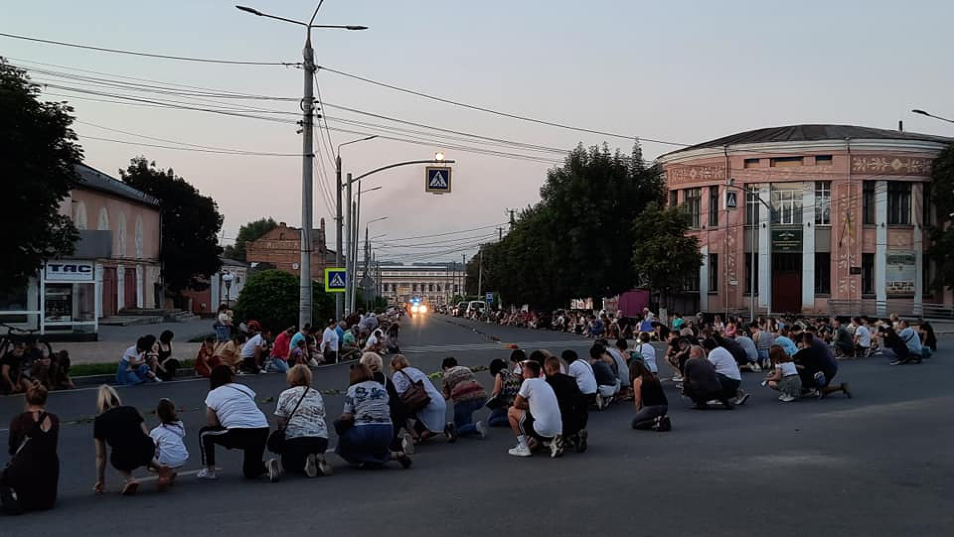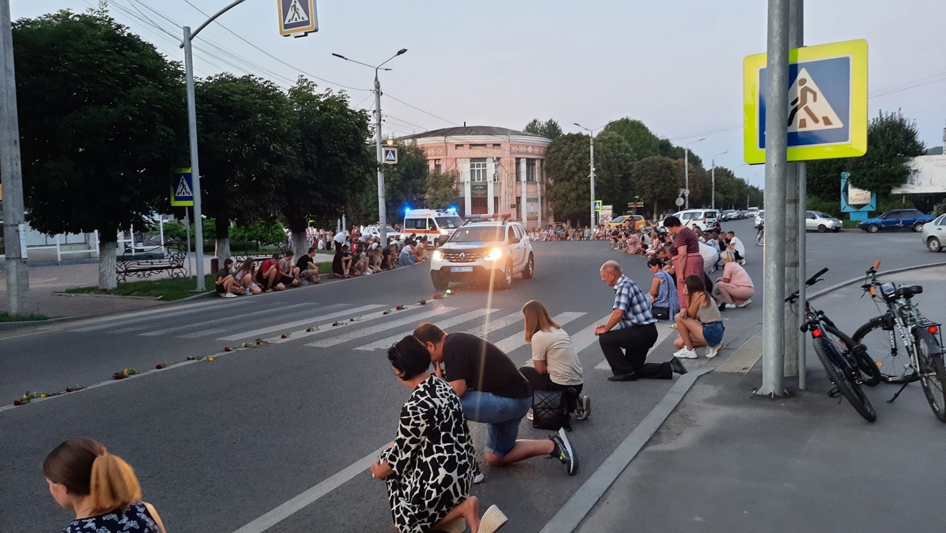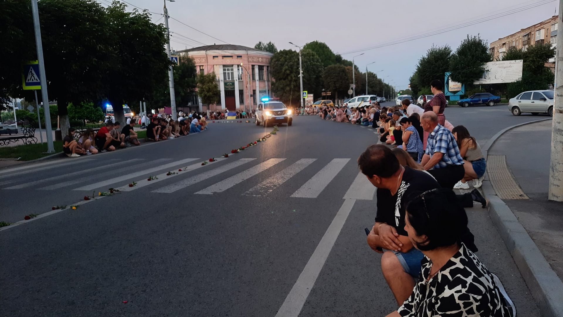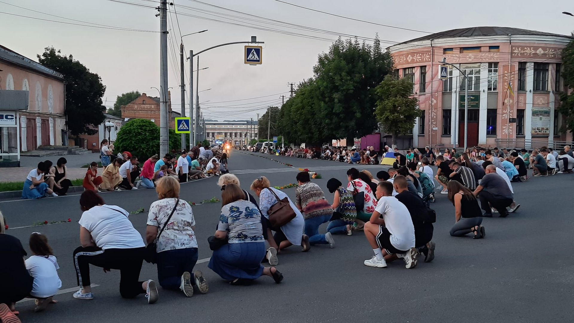 - На колінах та з державними прапорами в руках люди створили живий коридор.