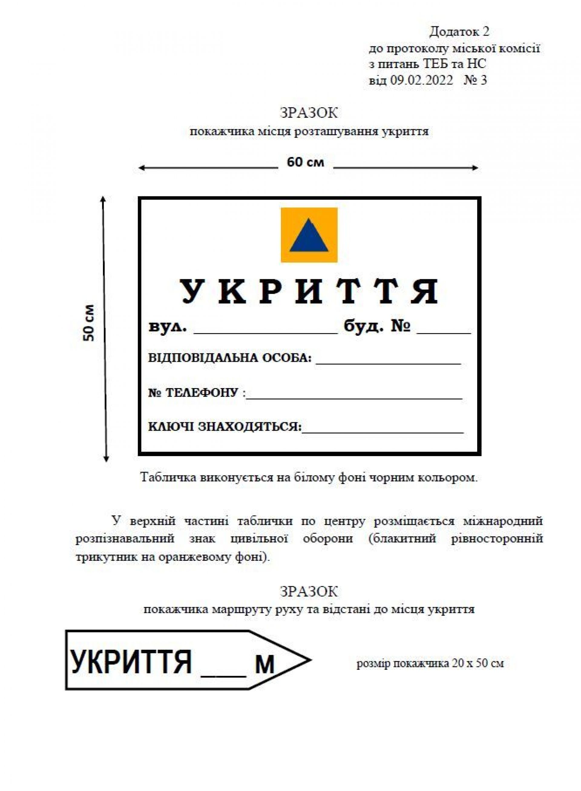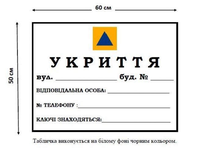 Місця розташування укриттів позначать за допомогою табличок (написів) та покажчиків руху до них. Виглядатиме це так: