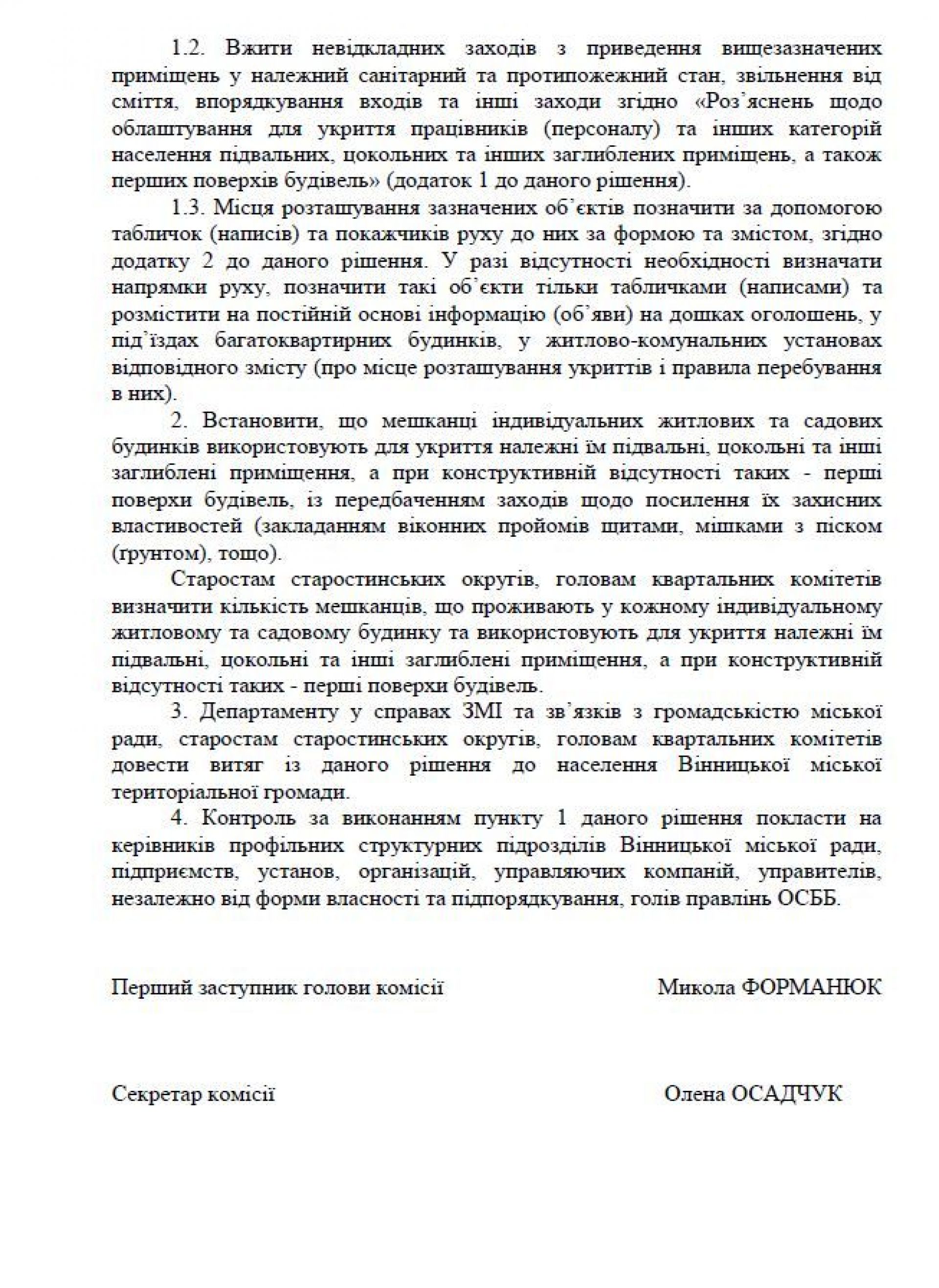 — Комісія вирішила, що керівники підприємств, установ, організацій, управляючі компаніями, управителі, незалежно від форми власності та підпорядкування, голови правлінь ОСББ, (крім балансоутримувачів (власників) сховищ, протирадіаційних та найпростіших укриттів) повинні визначити для укриття населення (працівників) підвальні, цокольні та інші заглиблені приміщення, а при конструктивній відсутності таких - перші поверхи будівель, — розповів начальник відділу з питань надзвичайних ситуацій, мобілізаційної і оборонної роботи та режиму секретності міської ради Олег Парфілов. — Також потрібно привести їх у належний санітарний та протипожежний стан, звільнити від сміття, впорядкувати входи.