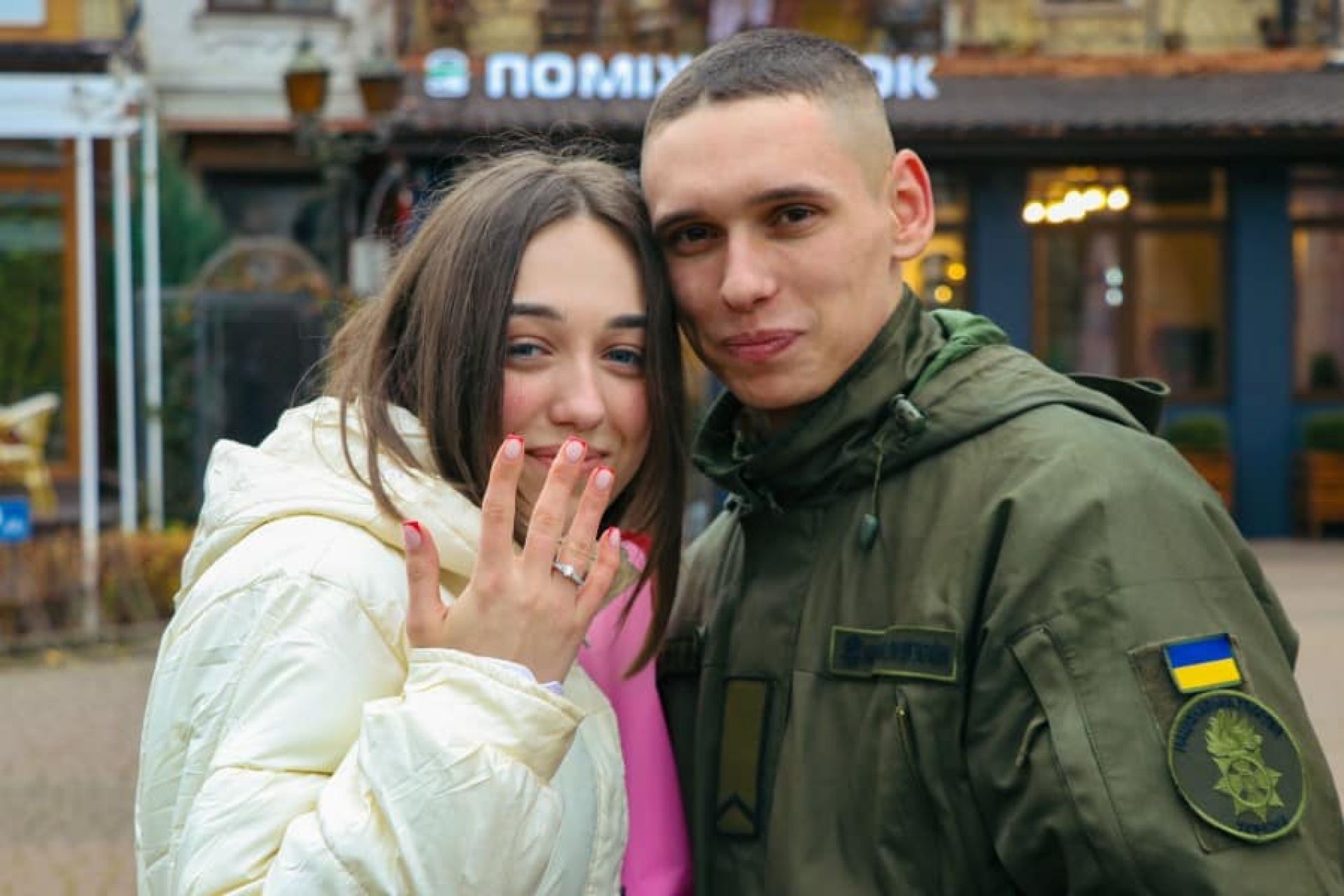 - У середмісті молодий нацгвардієць встав на коліно та освідчився своїй коханій. Дівчина прийняла обручку та відповіла «Так».