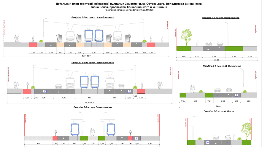У детальному плані території також читаємо про реконструкцію проспекту Коцюбинського з влаштуванням зупинок громадського транспорту та зміною положення трамвайних колій. У плані йдеться, що трамваї їздитимуть посередині проїжджої частини, так само як на вулиці Соборній.
