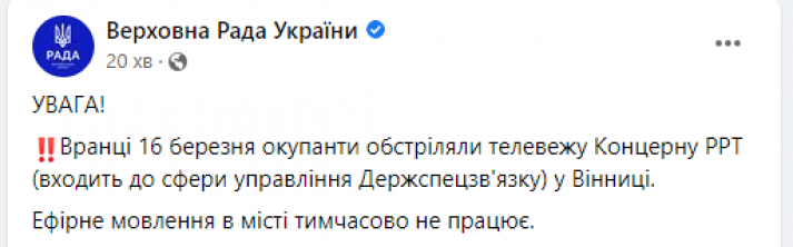 «УВАГА! Вранці 16 березня окупанти обстріляли телевежу Концерну радіомовлення, радозв'язку та телебачення (входить до сфери управління Держспецзв'язку) у Вінниці», — повідомили на офіційній сторінці Верховної Ради України.