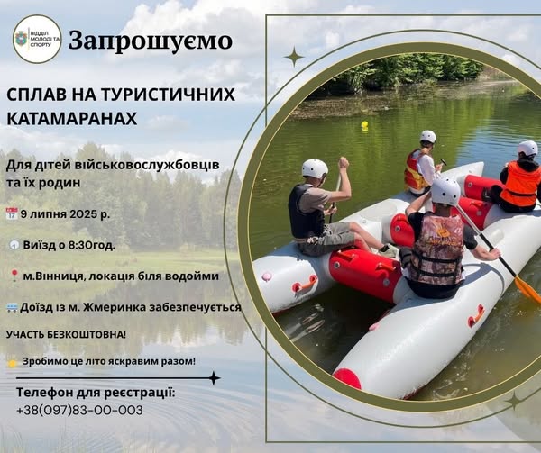 - На безкоштовний сплав на катамаранах запрошують дітей військовослужбовців та їхніх родини. Захід організовує відділ молоді та спорту Жмеринської міської ради з метою підтримати сім’ї захисників і подарувати дітям яскравий літній відпочинок.