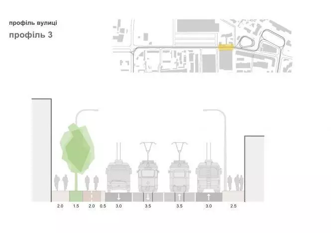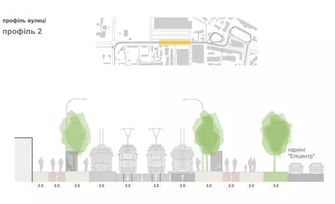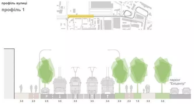На ділянці між «Епіцентром» та розворотним колом трамваю велодоріжка пролягатиме лише з одного боку вулиці — навпроти гіпермаркету. З іншого боку матимемо тротуар, шириною 2,5 метри.
