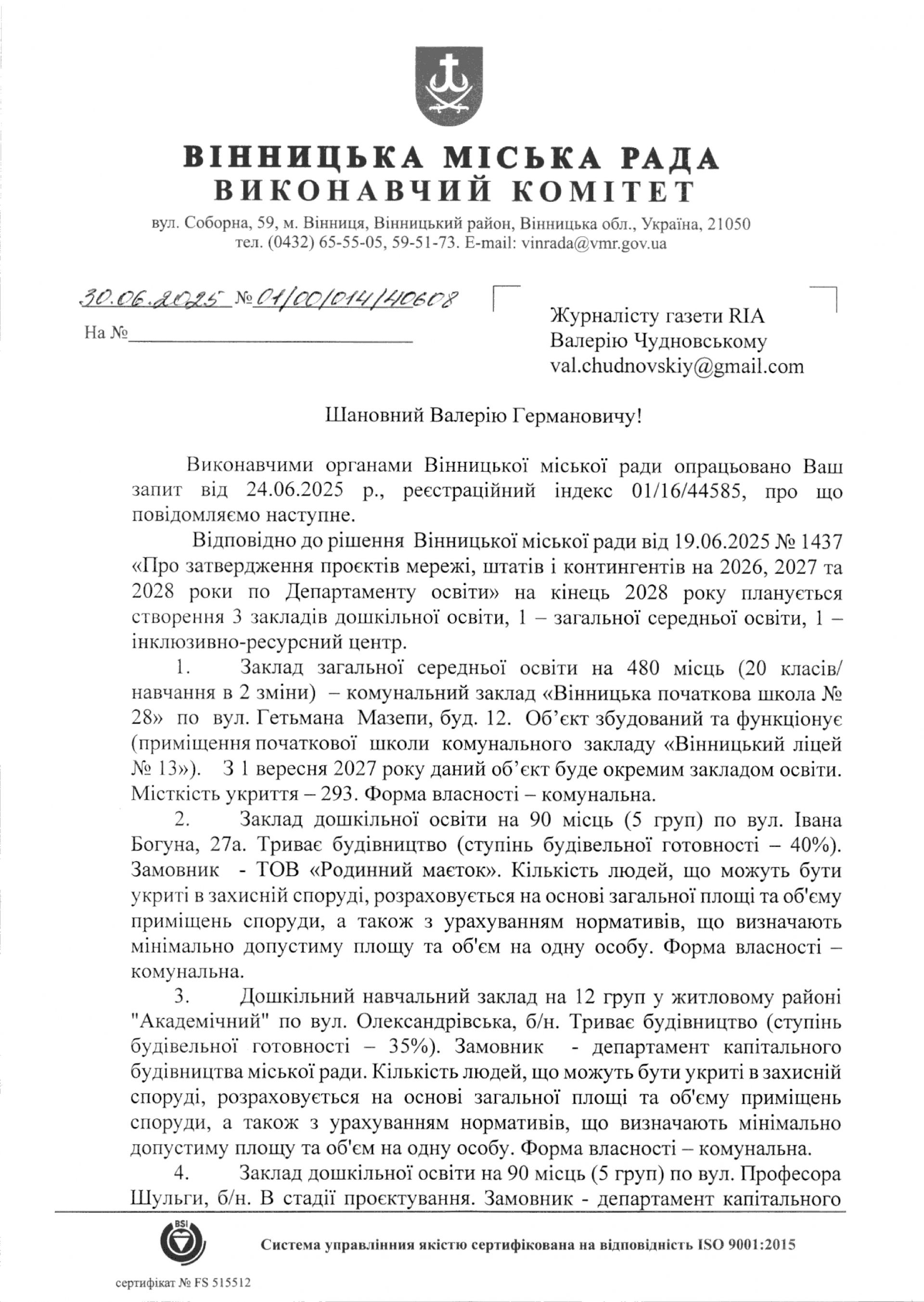 Наступними у відповіді на наш запит є дитячі садочки. Їх за рішенням виконкому на кінець 2027 року буде плюс три: