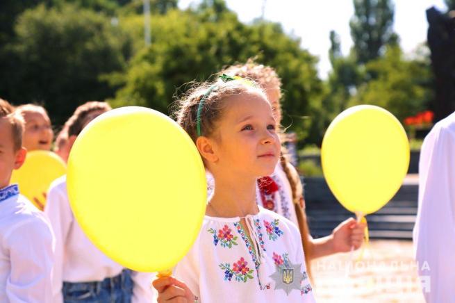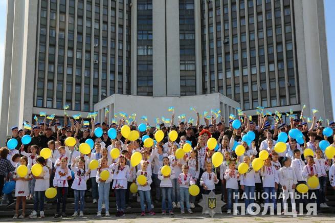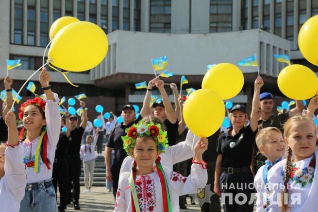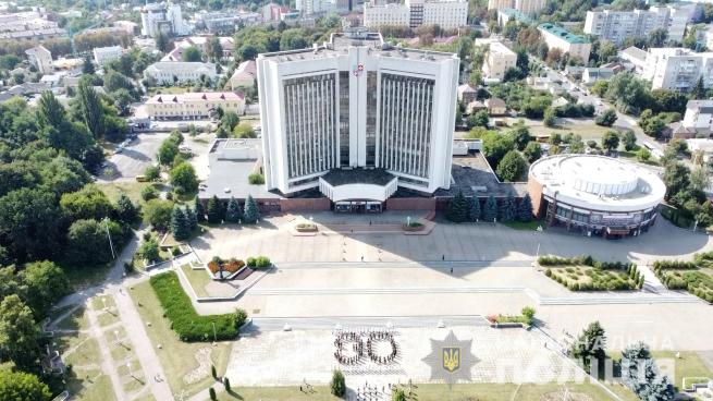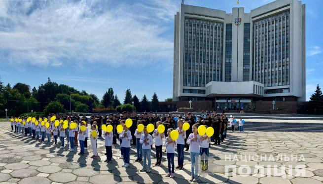 Поліцейські з різних підрозділів Головного управління Національної поліції в області, бійці військової частини 3008 Національної гвардії України та діти відтворили символ 30-річчя Незалежності України.