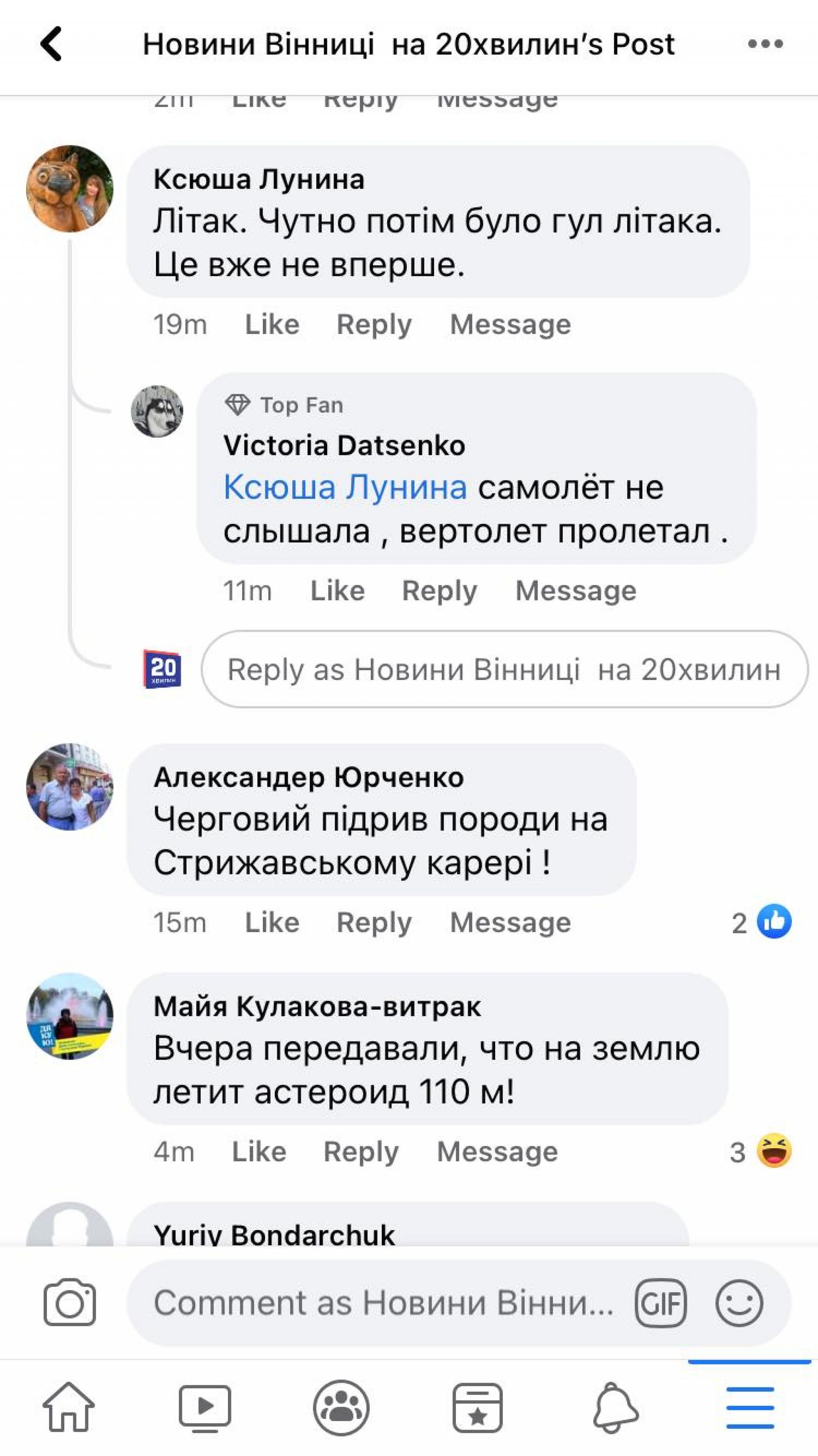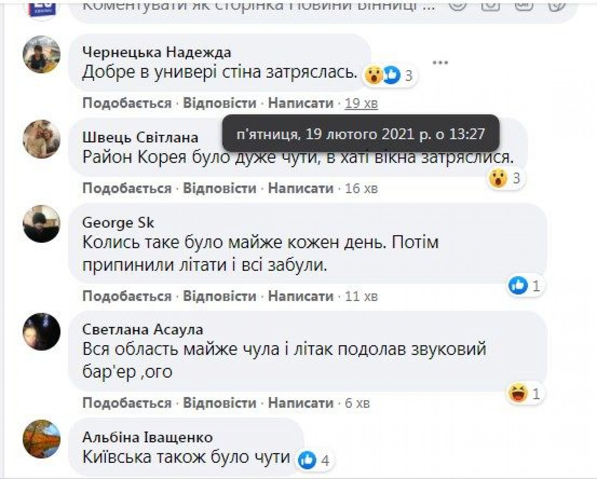 — Те, що ви почули, скоріше за все, був винищувач, який подолав звуковий бар'єр. Коли це стається, можна почути характерний хлопок, — розповідає прес-секретар Повітряних сил ЗСУ у Вінницькій області Юрій Ігнат. — Щотижня в небі над Вінницею можна побачити й іншу техніку, зокрема літак АН-26. Він літає і сьогодні. Але цей літак не може подолати звуковий бар'єр.