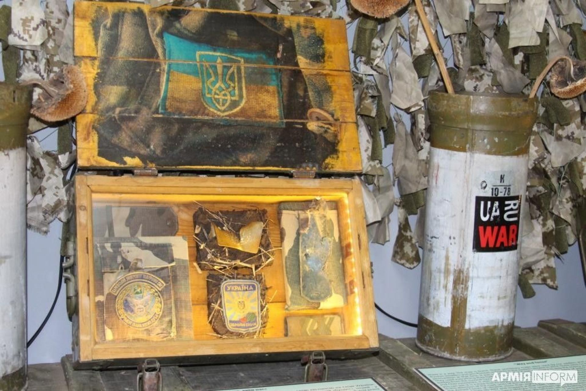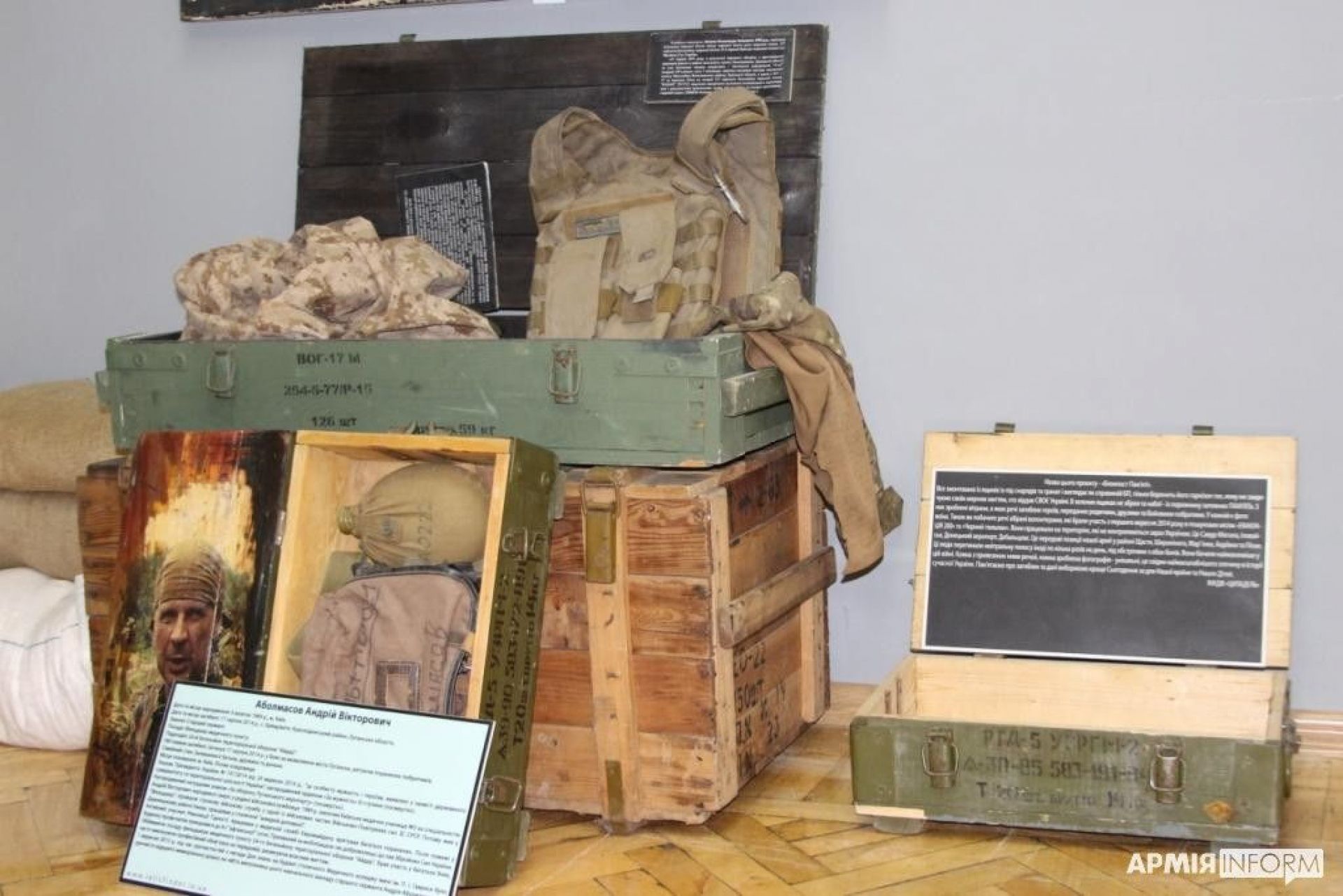 - Це речі загиблих українських військових, вояків добровольчих батальйонів, Національної гвардії України, підрозділів МВС та СБУ, розміщені у вітринах — ящиках від боєприпасів.