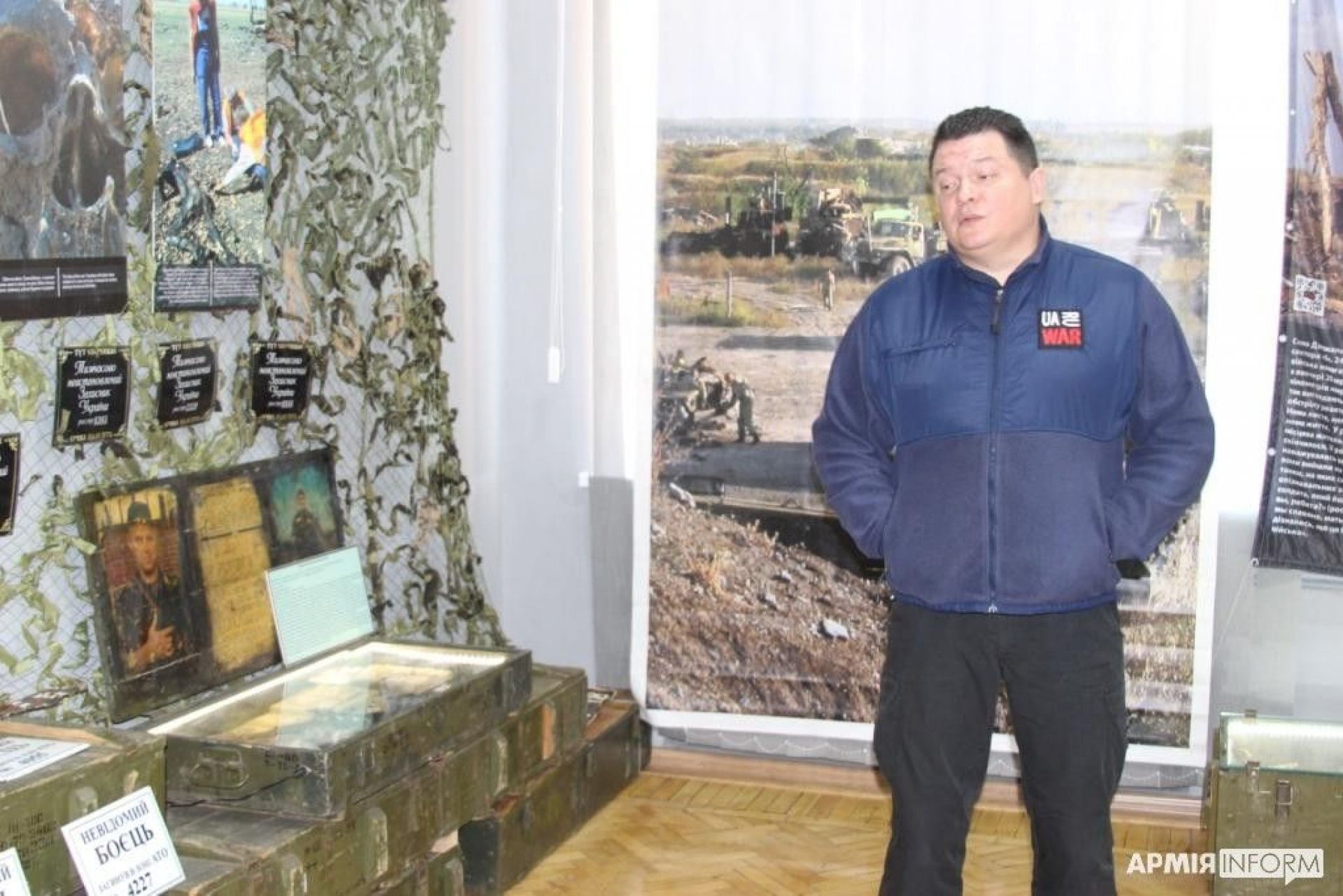 — Із Олегом ми познайомились ще у 2014 році, він тоді був начальником групи цивільно-військового співробітництва в місті Авдіївка Донецької області. На одній зі світлин він знімає номер з машини, який також представлений в експозиції. Планували відкривати виставку разом із ним. На жаль, кілька днів тому побратима забрала зла хвороба. І сьогодні вже його речі мають свою вітрину, — розповів Павло Нетьосов.