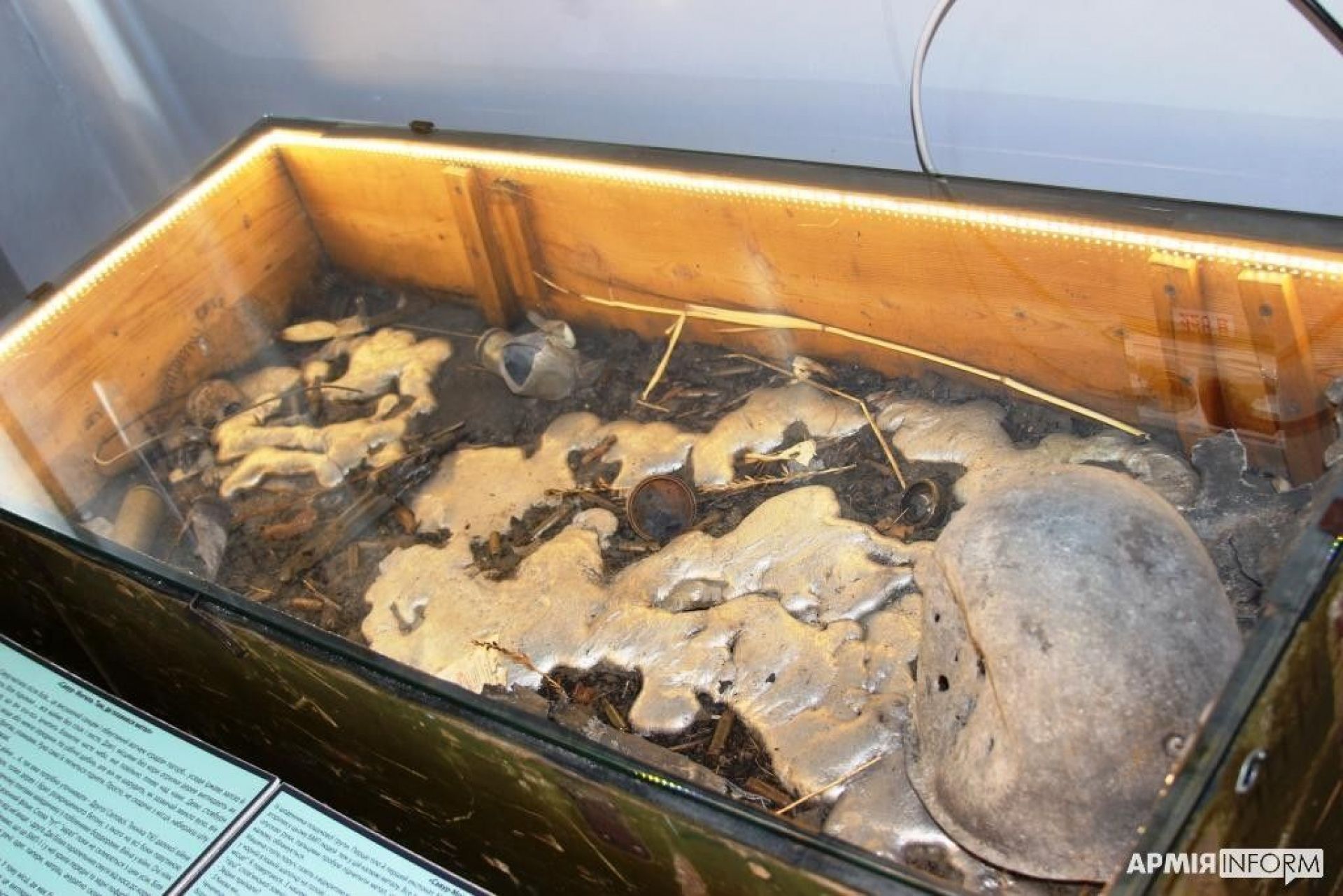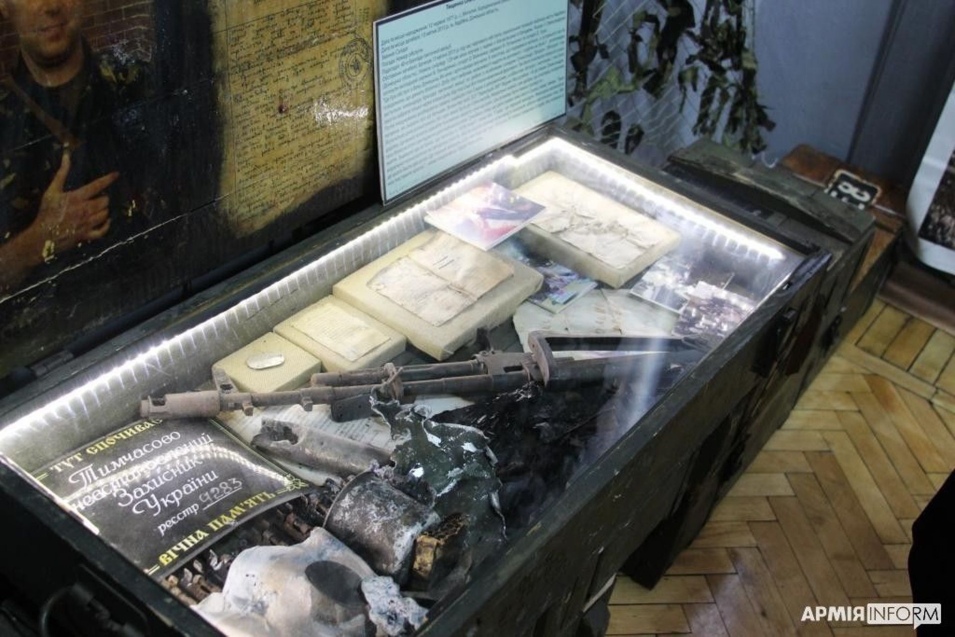 — Частину представлених експонатів зібрали волонтери під час евакуації тіл військових із району проведення АТО та їх ідентифікації, — розповів Павло Нетьосов, волонтер пошукової місії «Евакуація-200». — Серед них ікони, уламки снарядів, розпечене залізо, особисті речі загиблих захисників. Іншу частину артефактів передали рідні та побратими полеглих вояків.