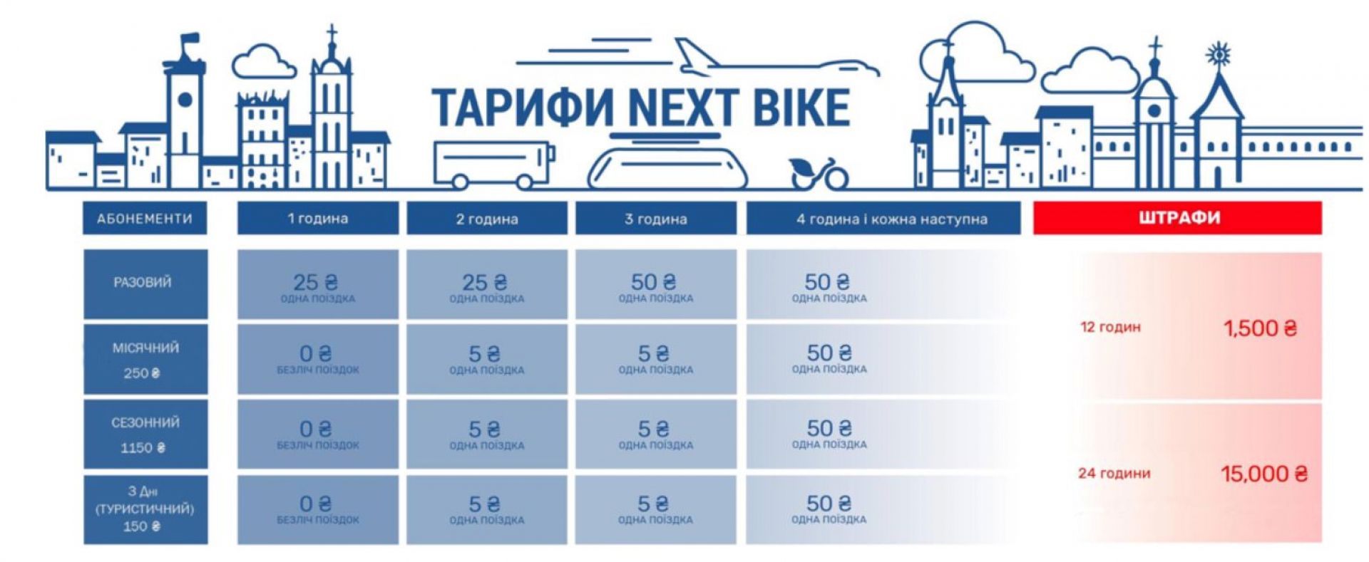 При купівлі абонемента — 250 грн місячний, 1150 грн на увесь сезон — вартість поїздки зменшується: щодня перші 60 хв на поїздку безплатні, друга і третя години — по 5 грн, четверта година прокату — 50 грн.