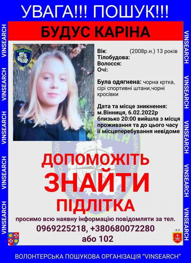 - Шукають 13-річну вінничанку Каріну Будус. Дівчина 6 лютого близько 20.00 пішла з дому на прогулянку та до теперішнього часу не повернулась.