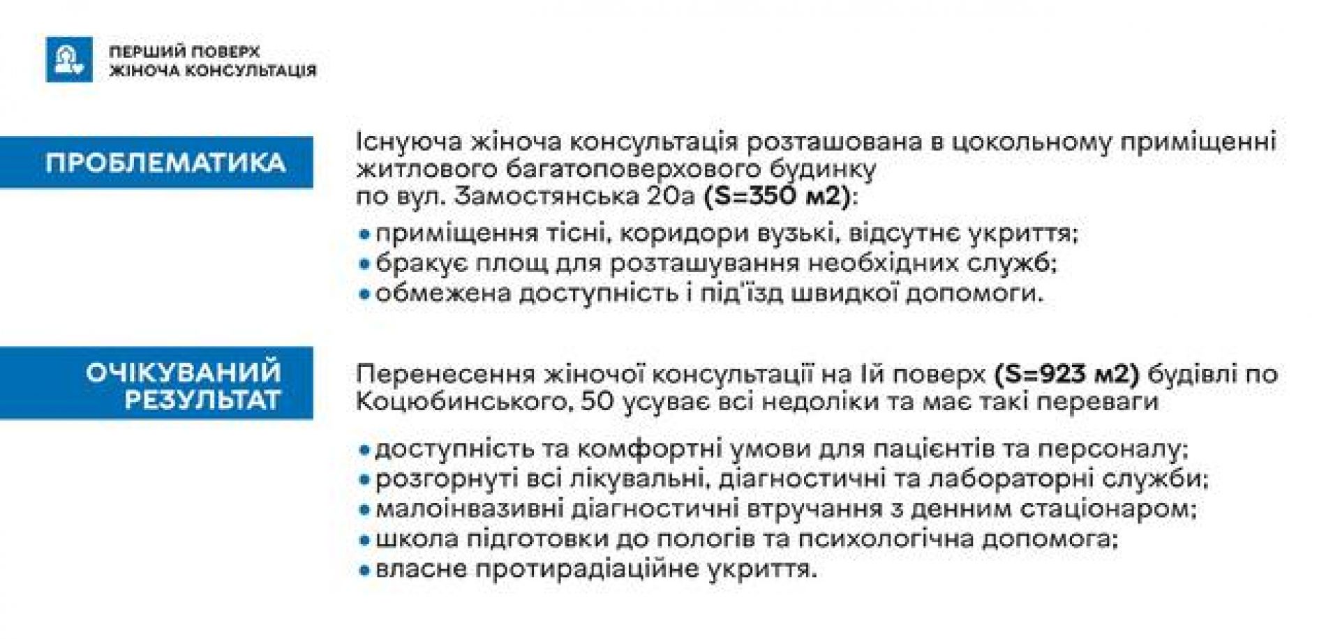 - Перший поверх — жіноча консультація, яка переїде сюди з вулиці Замостянської, 20. Тут будуть проводити спостереження вагітності, діагностику та необхідне лікування.