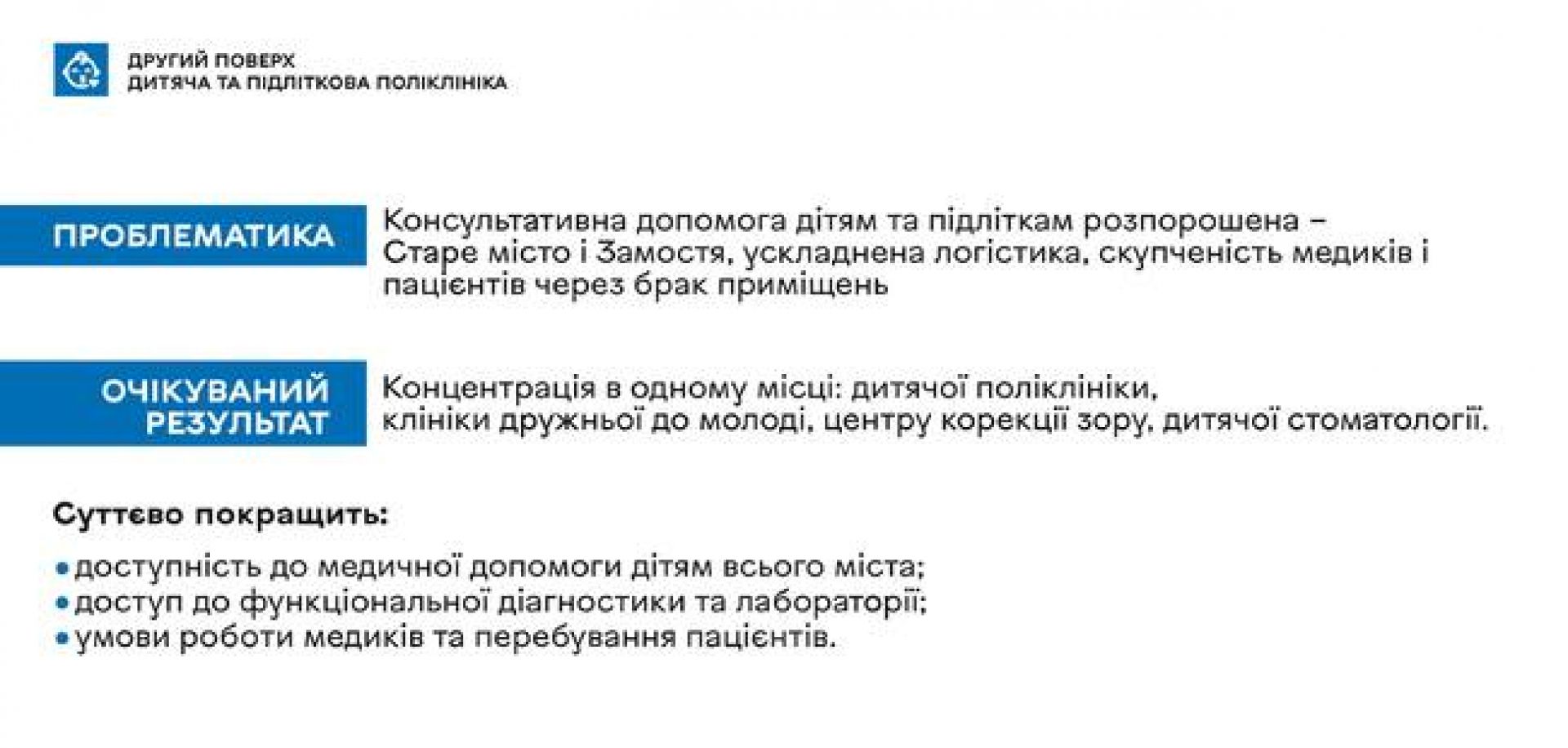 - Другий поверх займе дитяча поліклініка, яка переїде з вулиці Синьоводської, 142. Також тут працюватиме центр корекції зору для дітей, «Клініка, дружня до молоді» та дитячий стоматолог.