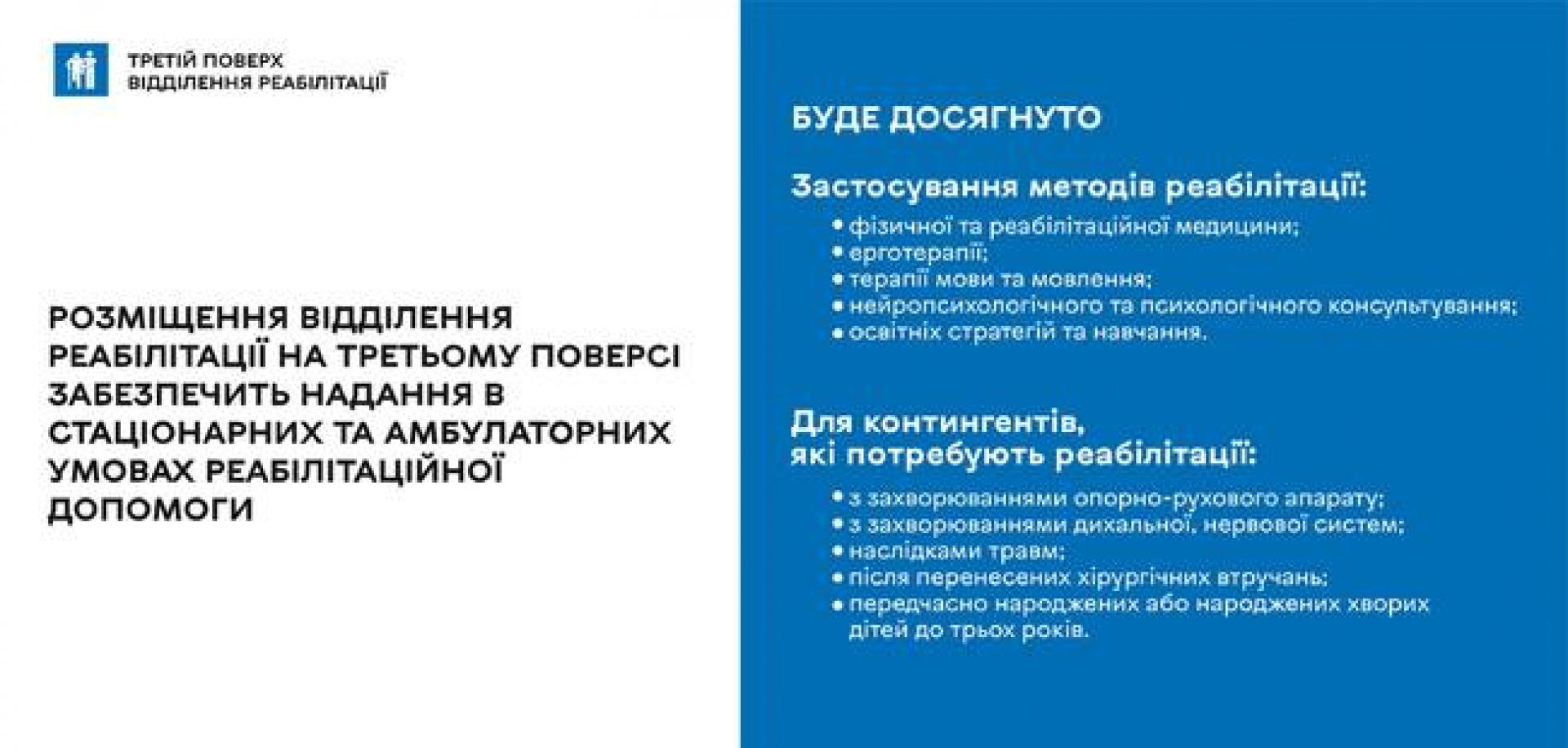 - Третій поверх відведуть під відділення реабілітації, де пацієнти зможуть проходити лікування у стаціонарі під цілодобовим наглядом медперсоналу.