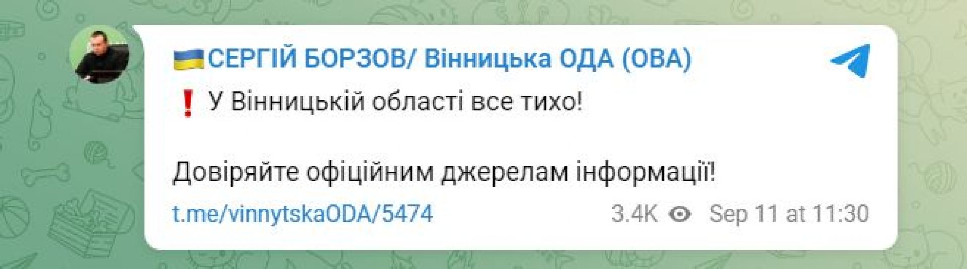«Під час повітряної тривоги безліч інформаційних каналів повідомляли про вибухи на території Вінницької області, — пише Ситуаційний центр. — Сергій Борзов прокоментував дану ситуацію: «У Вінницькій області все тихо! Довіряйте офіційним джерелам інформації!». Друзі, зберігаємо спокій, довіряємо лише офіційним джерелам, відповідно реагуємо на сигнал повітряної тривоги і все буде Україна».