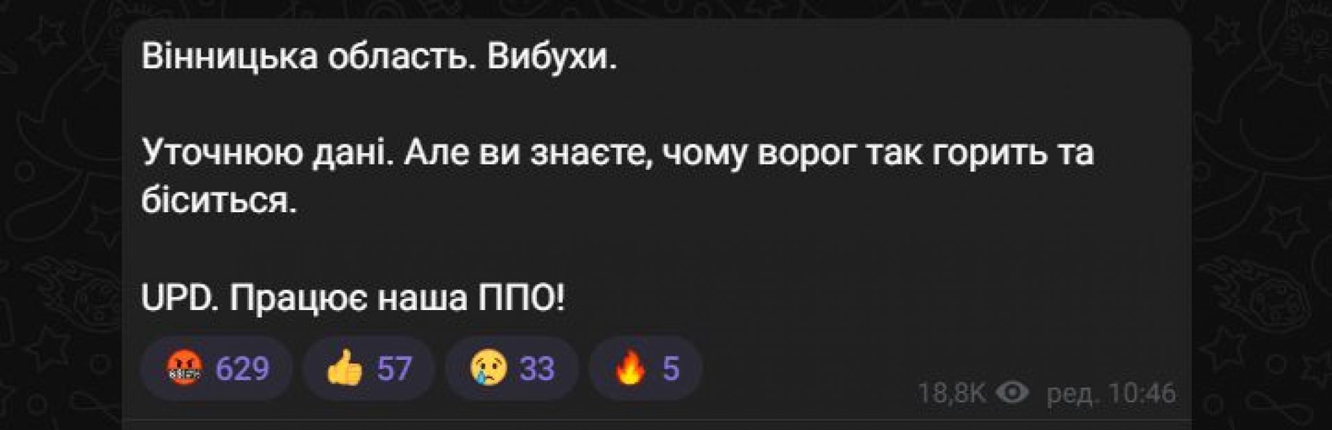 — Вінницька область. Вибухи, — написав Гончаренко. — Уточнюю дані. Але ви знаєте, чому ворог так горить та біситься.