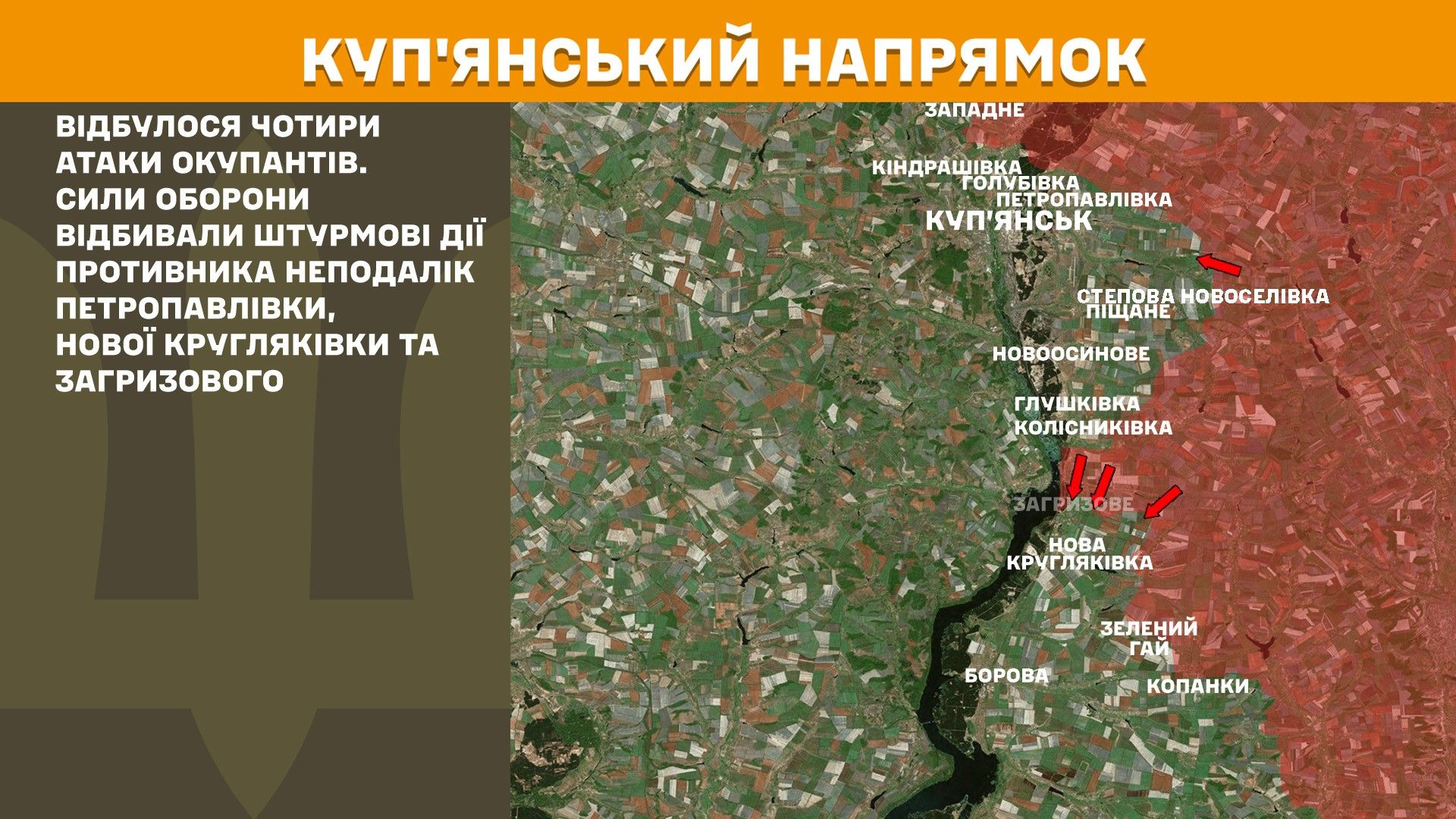 На Куп’янському напрямку відбулося чотири атаки окупантів. Сили оборони відбивали штурмові дії противника неподалік Петропавлівки, Нової Кругляківки та Загризового.