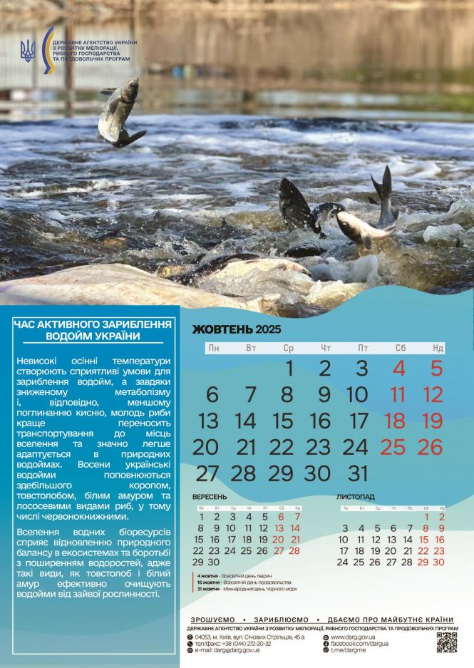 Державне агентство меліорації та рибного господарства оголосило жовтень часом активного зариблення українських водойм. Низькі осінні температури створюють ідеальні умови для транспортування молоді та її адаптації. Водойми поповнюють коропом, товстолобом, білим амуром та лососевими, які відновлюють природний баланс і очищують екосистеми.