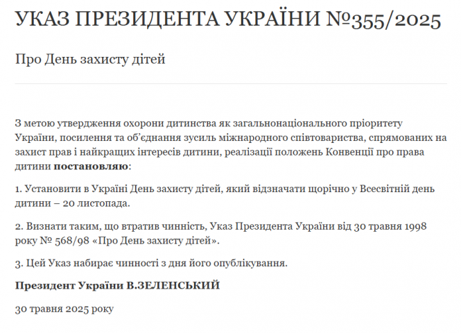 Президент України Володимир Зеленський підписав Указ №355/2025, яким змінив дату відзначення Дня захисту дітей. Відтепер це свято відзначатимуть щорічно 20 листопада, у Всесвітній день дитини.