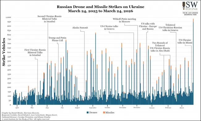 Вчорашній обстріл, за умовну добу з 18.00 23 березня по 18.00 24 березня, став найбільшим за всю війну. Росія випустила 982 цілі, серед яких 948 безпілотників.