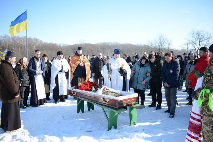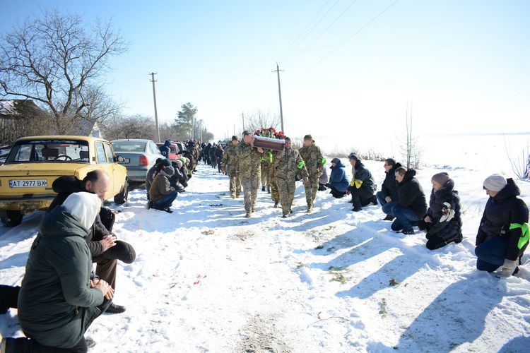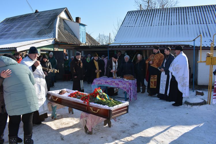 В центрі села, приклонивши коліно, віддали шану Герою учні та працівники школи, учасники траурної процесії. По обидва боки труни йшла у зажурі почесна варта із військових. Додавали скорботи звуки оркестру.