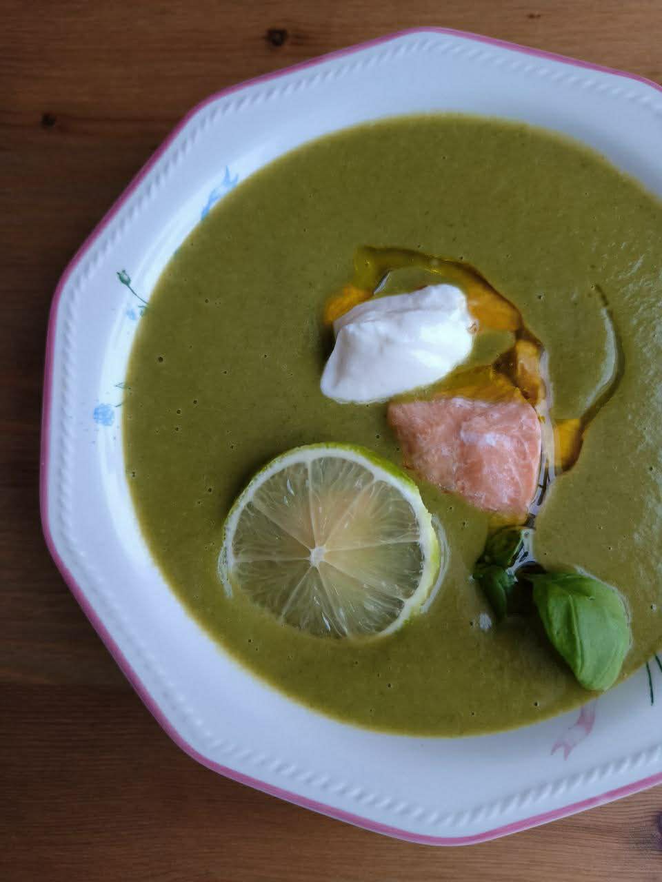 Фініш: додайте вершки, спеції та подавайте з лососем і лаймом, чайною ложкою олії гарбузового насіння.
