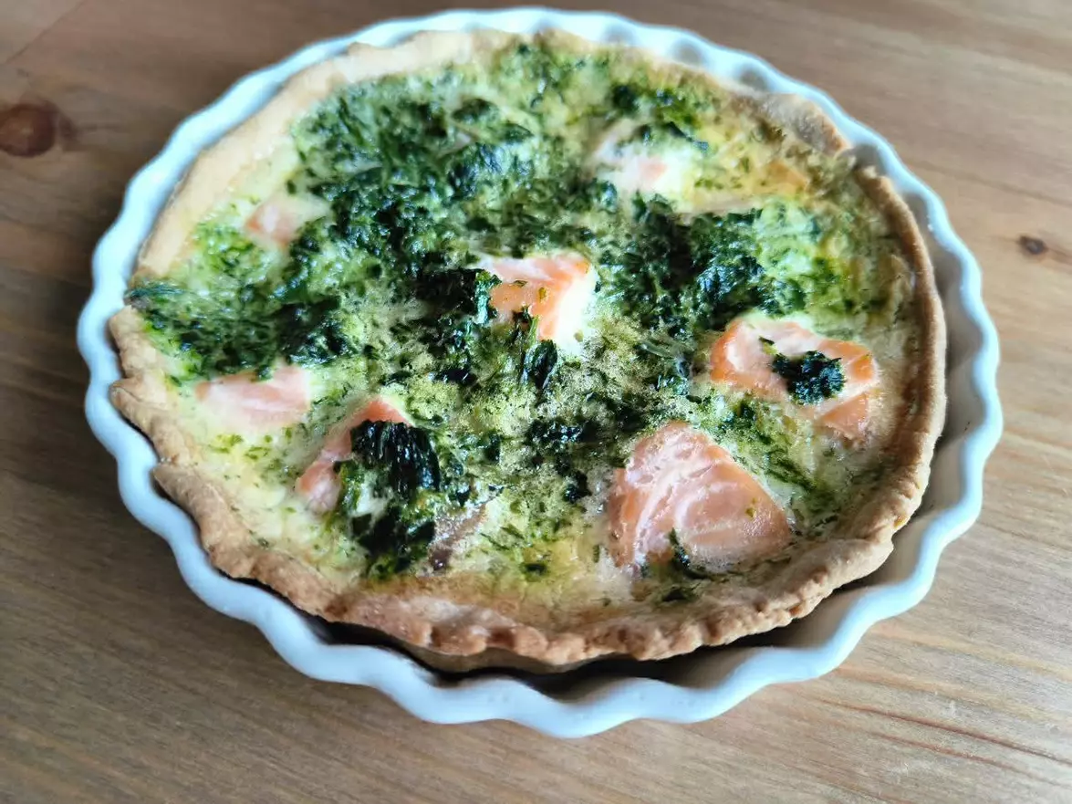 Далі на готову основу викладають шпинат, зверху — лосось і заливають все яєчно-вершковою сумішшю, присипають тертим сиром. Кіш випікають при 180°C до появи золотистої скоринки, після чого дають трохи охолонути перед подачею на стіл.