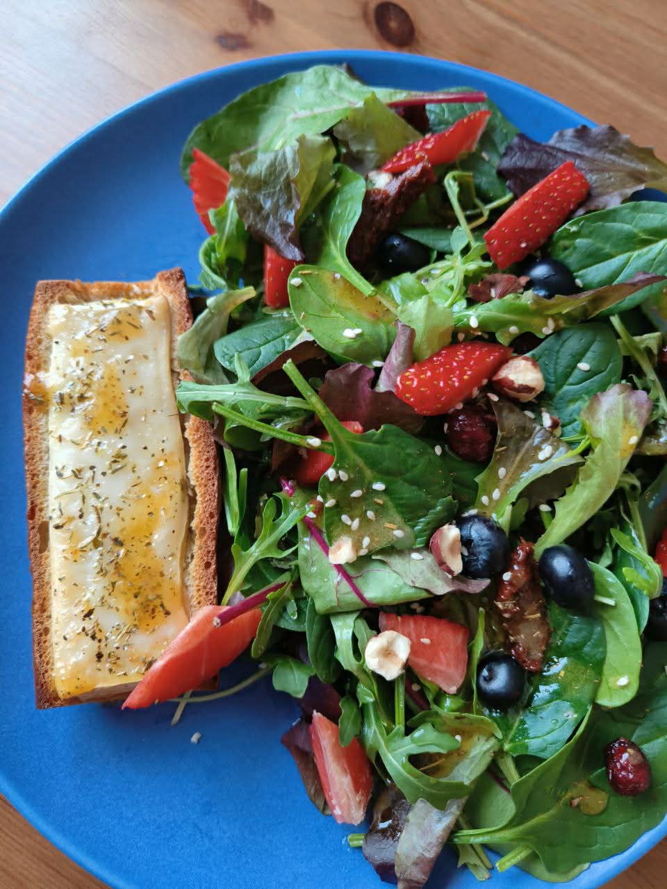 - Сир: козячий сир Soignon (Bûche de Chèvre) — кружальця товщиною 1.5–2 см.