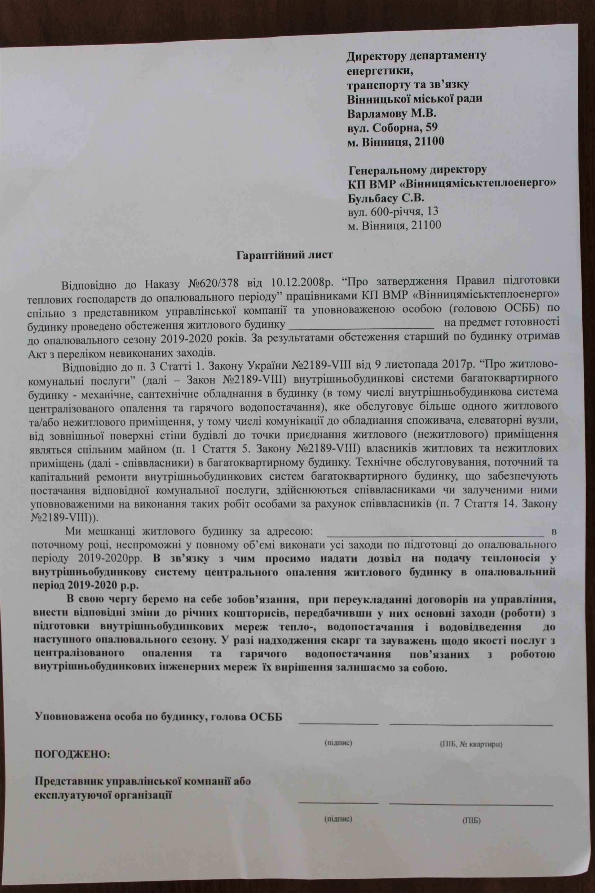 Підписали гарантійний лист, який прислали від «Вінницяміськтеплоенерго»?