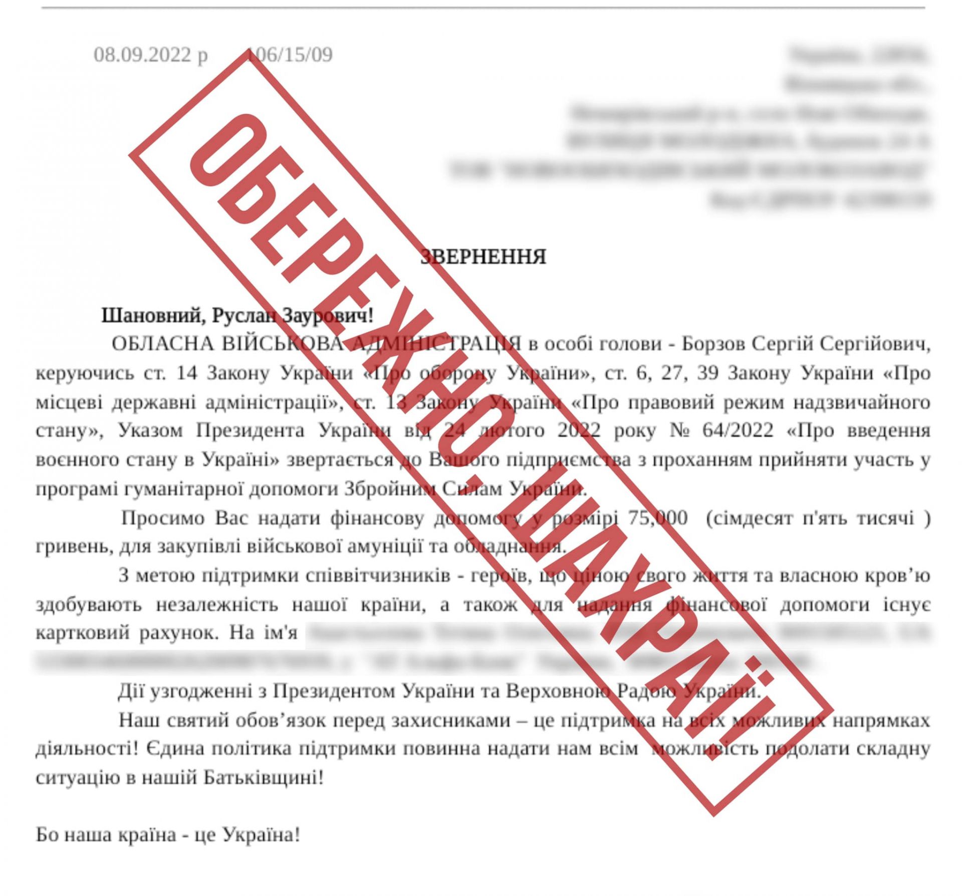— «Звернення» від мого імені розсилають керівникам підприємств «з проханням взяти участь у програмі гуманітарної допомоги Збройним Силам України — 75 тисяч гривень для закупівлі військової амуніції», — зазначає Борзов. — Якщо хтось із підприємців отримає подібного листа, прошу звернутись в ОВА або РВА.