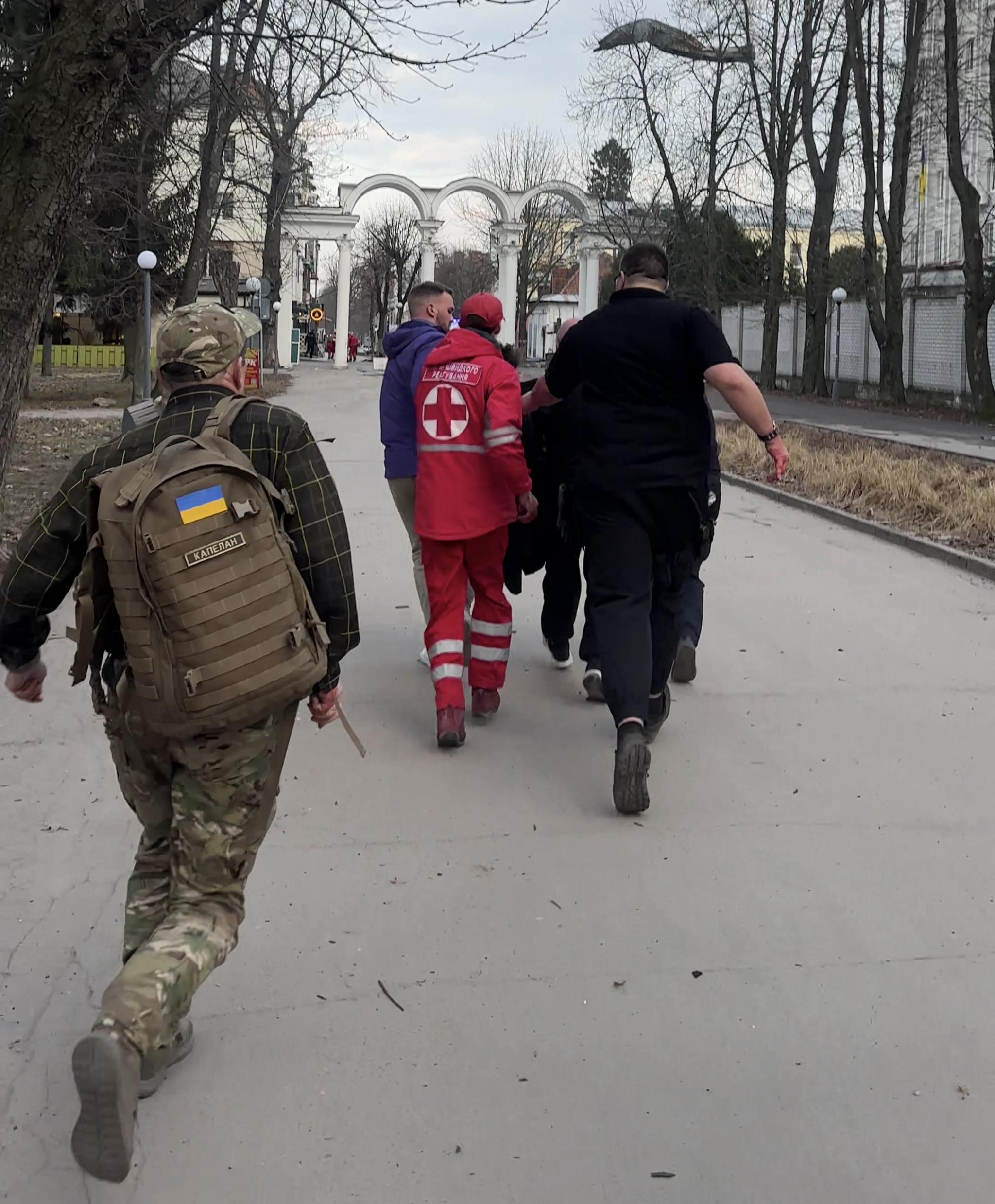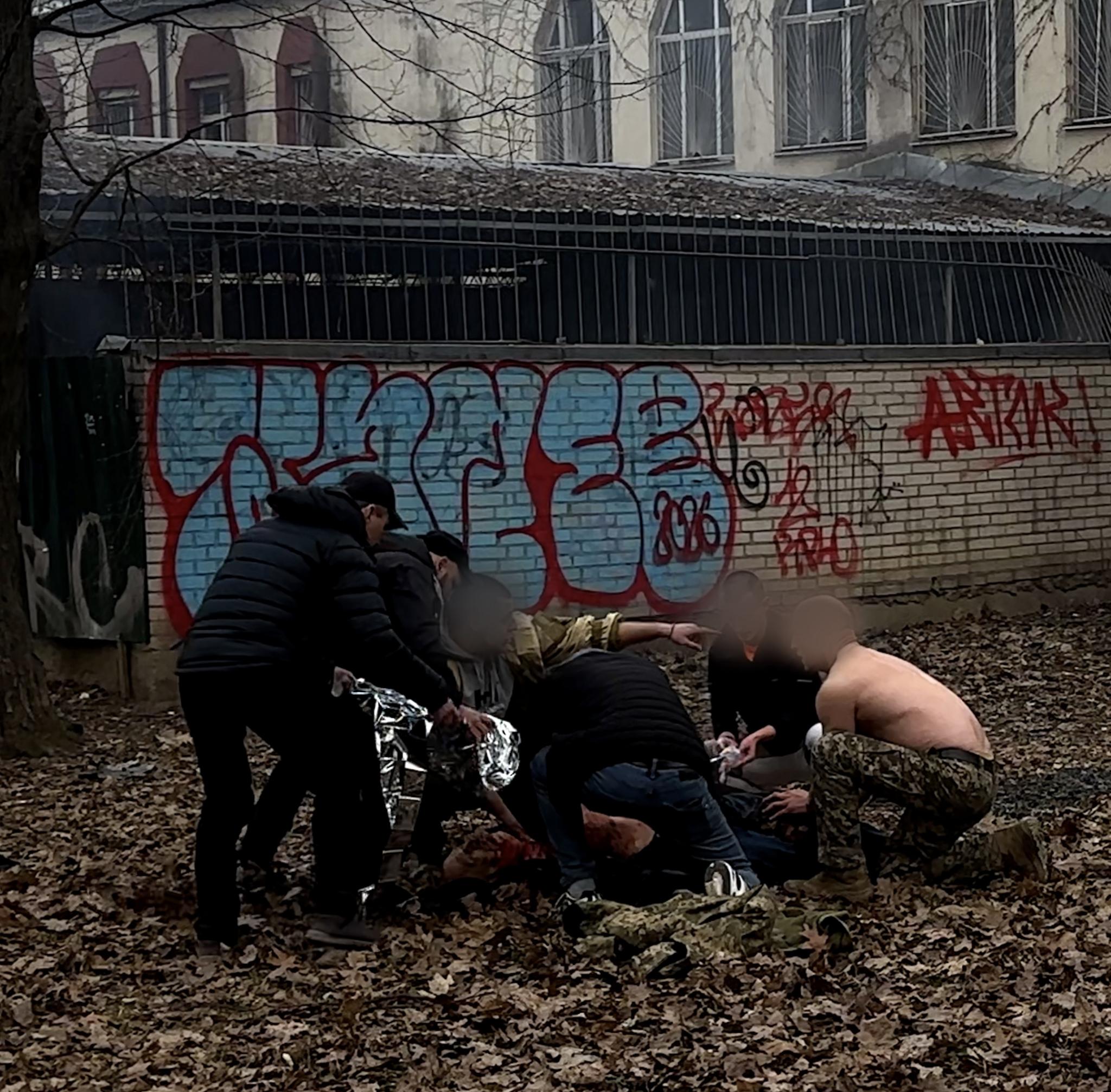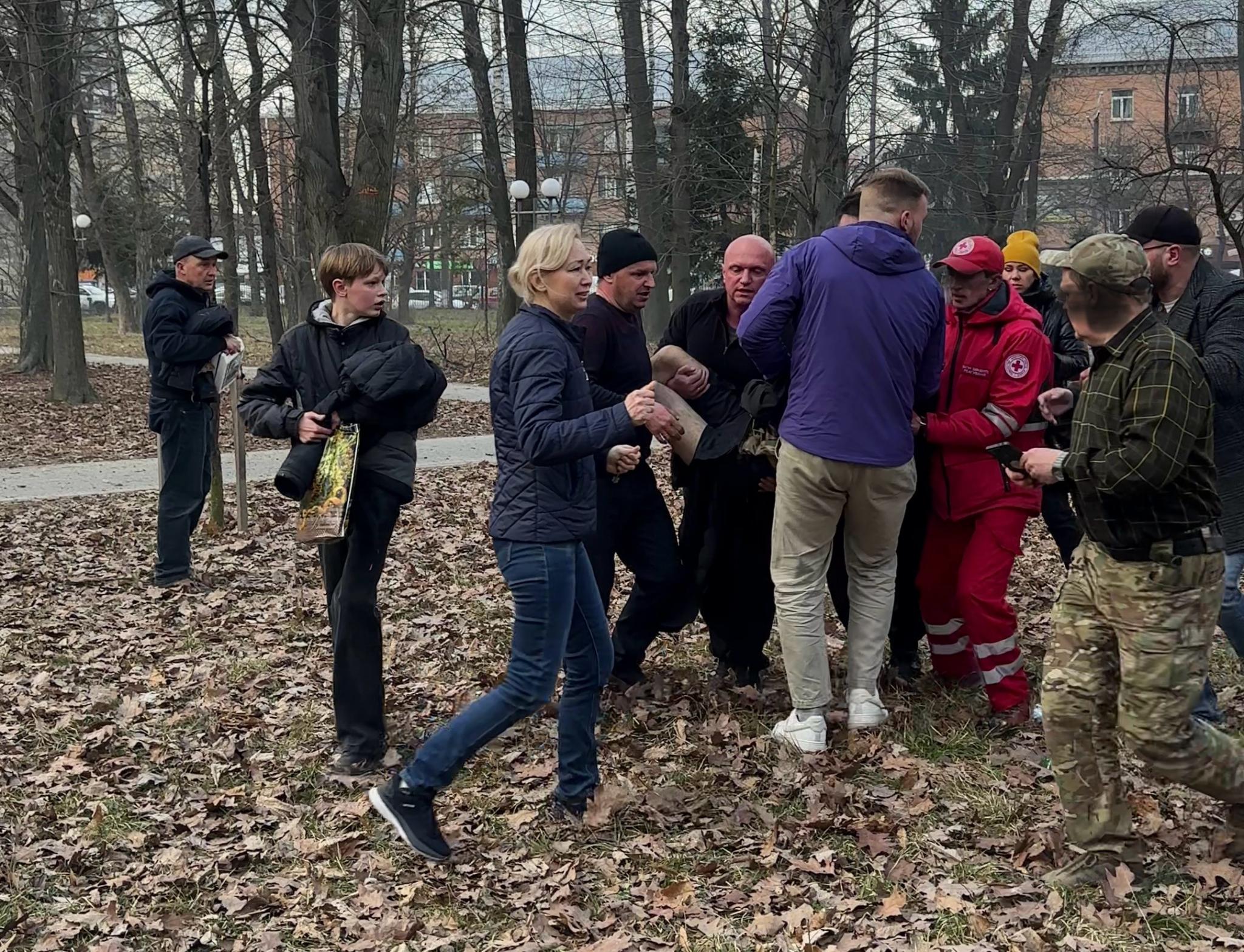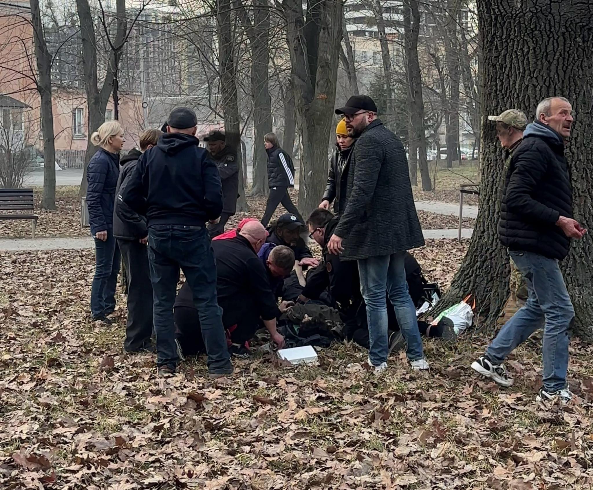 Люди та військові надавали першу допомогу — і цьому чоловіку, і хлопцю. Я в той момент гасила вогонь — там загорілося листя, і ми намагалися не допустити, щоб полум’я розгорілося сильніше. Ми викликали швидку, вона приїхала буквально за кілька хвилин. На жаль, чоловік на наших очах помер — він не дочекався допомоги. У нього було важке поранення легень. Хлопця забрали до лікарні, у нього було поранення черевної порожнини. Ще був чоловік, він лежав біля входу в парк з пораненою ногою. Йому теж надали допомогу.