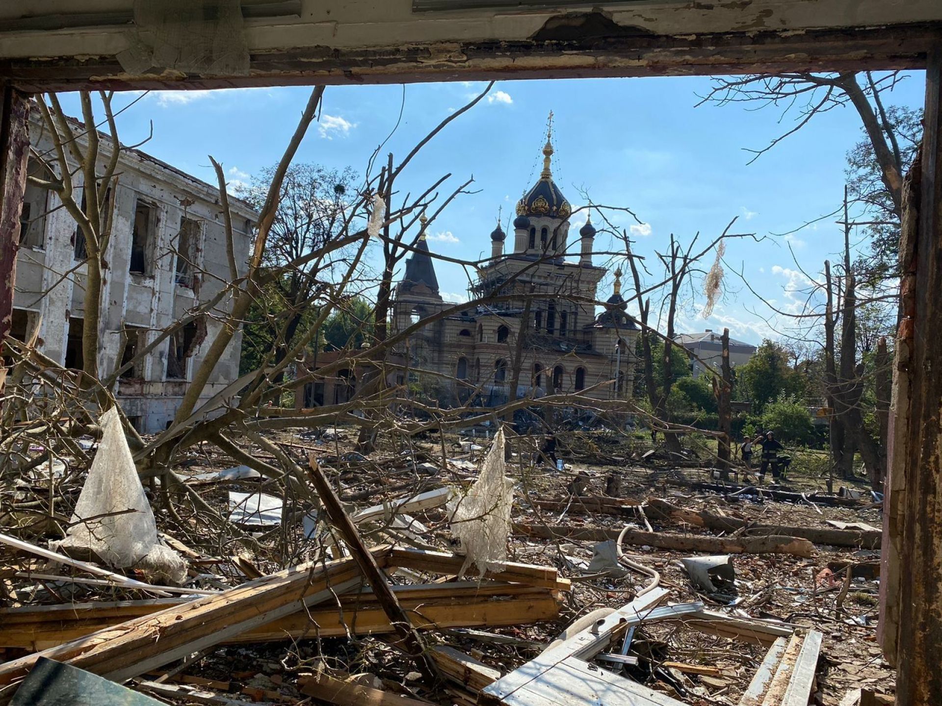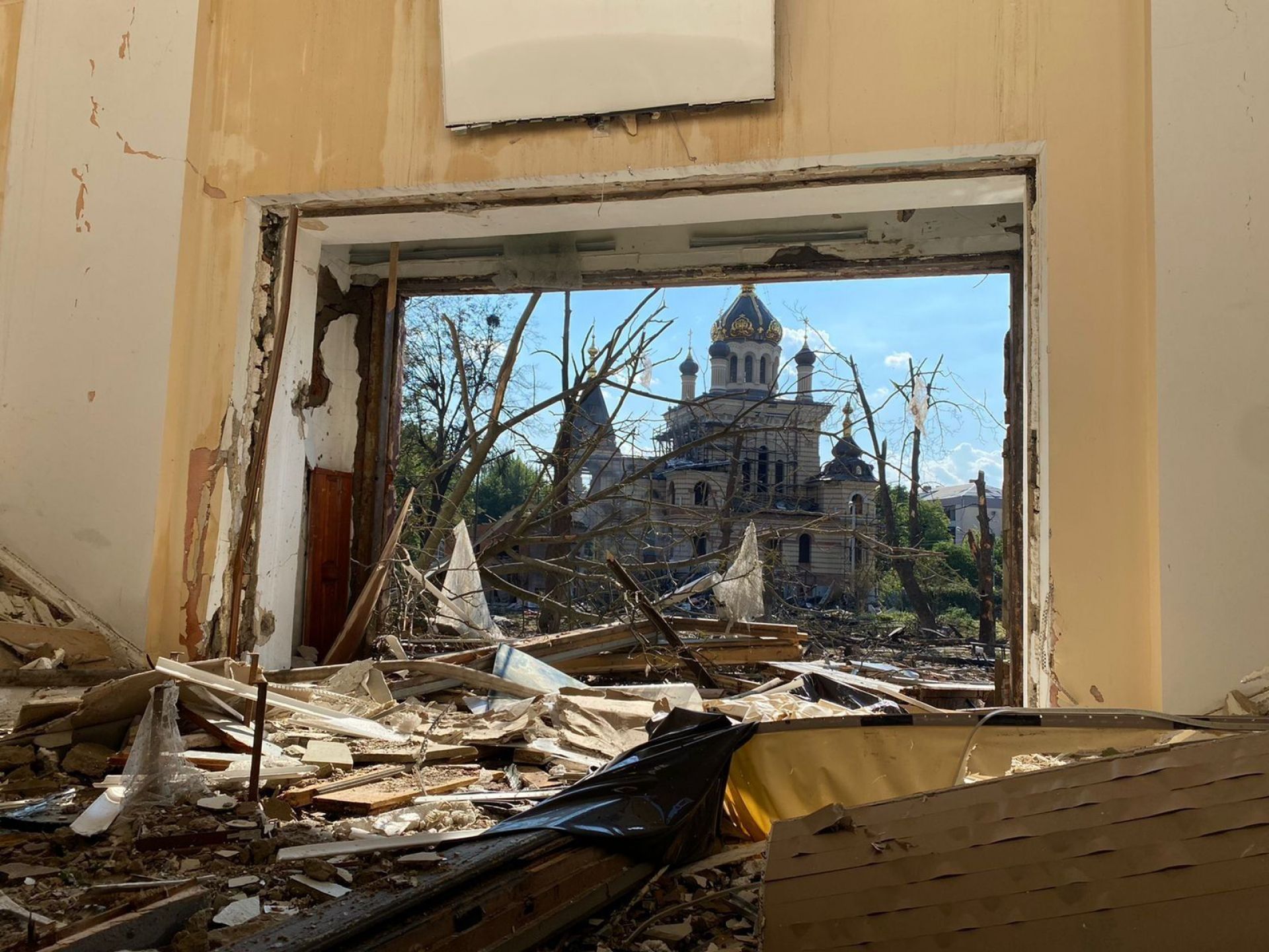 Так церква виглядає зі зруйнованого Будинку офіцерів: