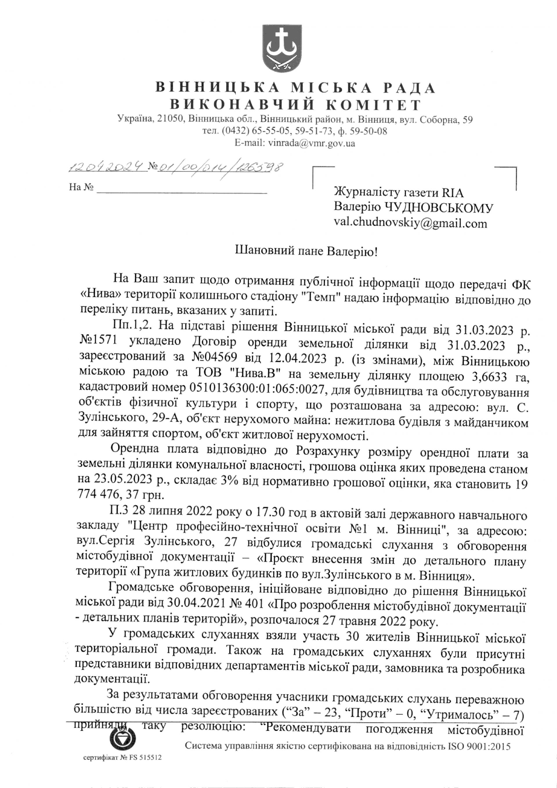 — Виконавчі органи міської ради не володіють цією інформацією. З метою збереження ваших законних прав на отримання публічної інформації, направляю Ваш запит для розгляду за належністю до футбольного клубу «Нива-Вінниця» за адресою: 21011, Вінниця, вулиця Ватутіна, 7 (на момент публікації матеріалу відповідь на це питання ще не отримали - авт.).