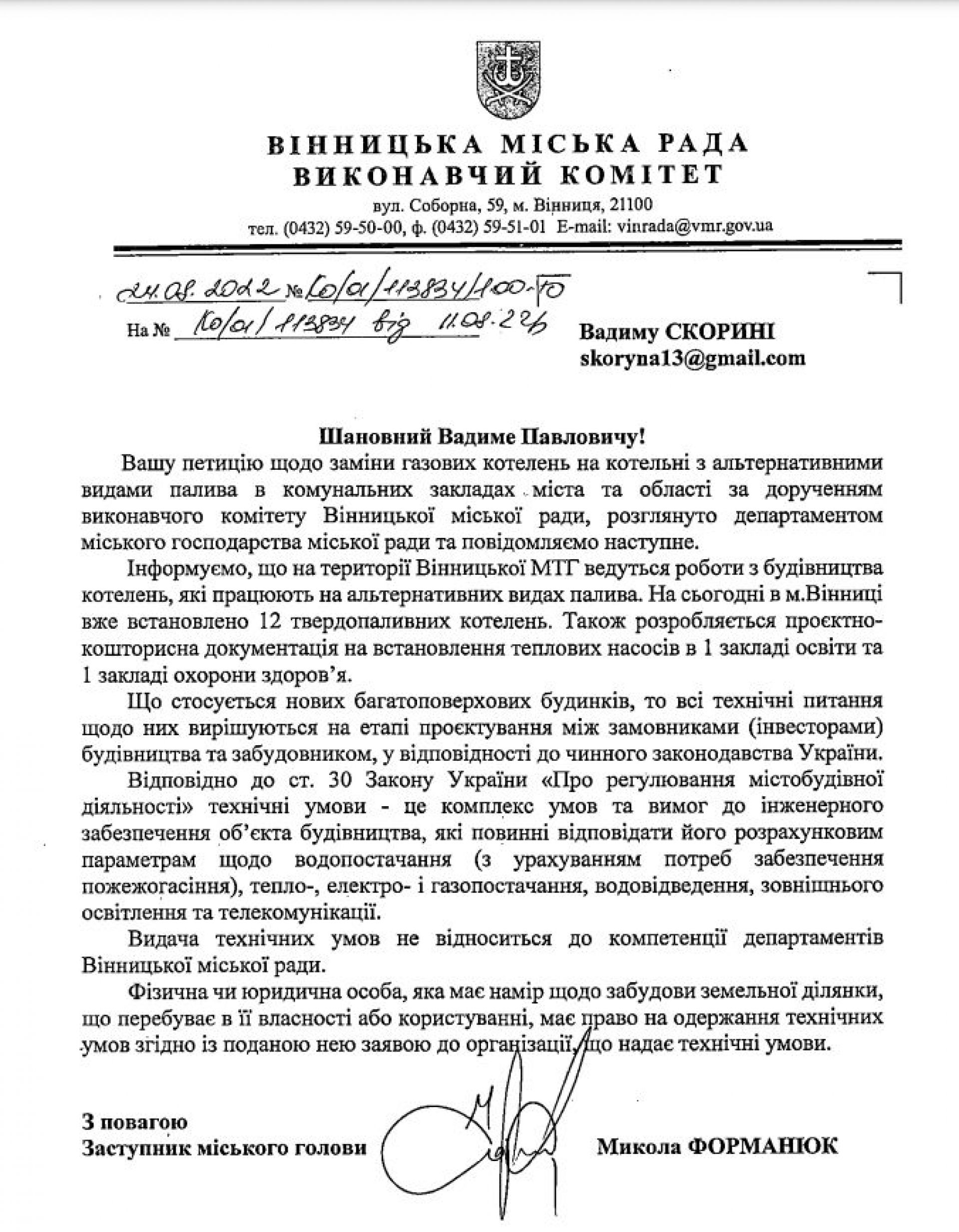 - Вінничанин Вадим Скорина 28 липня подав петицію, у якій просив у комунальних закладах замінити газові котельні на котельні з альтернативних видів палива. Звернення підтримали 354 людини, і воно отримало відповідь від мерії.