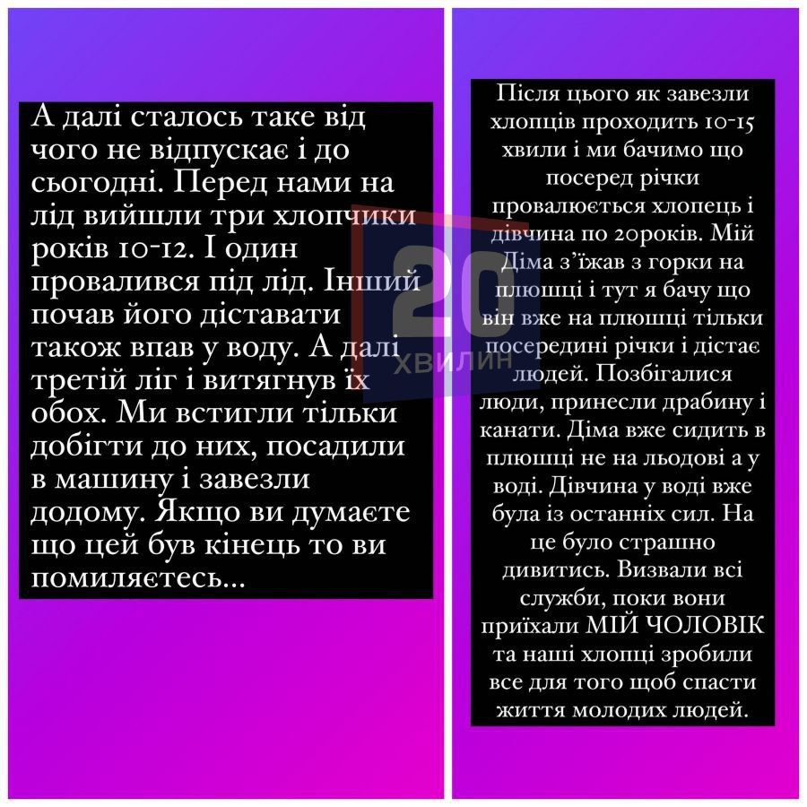 — До цієї пори не можу заспокоїтися. Ця картина стоїть перед очима. Перед нами на лід вийшли троє хлопчиків років 10-12. Один з них провалився під лід. Інший намагався йому допомогти, але також впав у воду. Зрештою третій хлопчик ліг на лід і дістав друзів з води. Це все тривало якусь долю секунди. Ми встигли добігти до дітей, посадили їх в машину і завезли додому. А потім повернулися до річки, — каже дівчина.