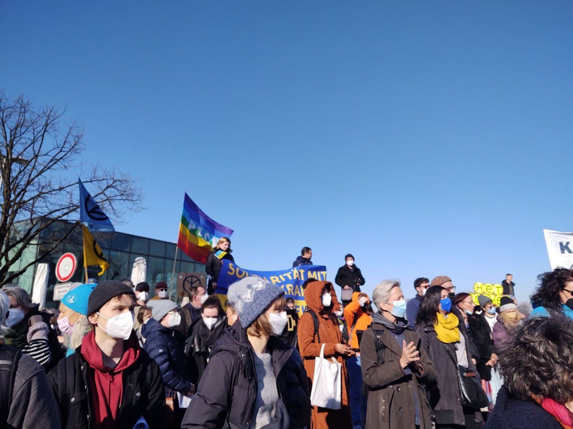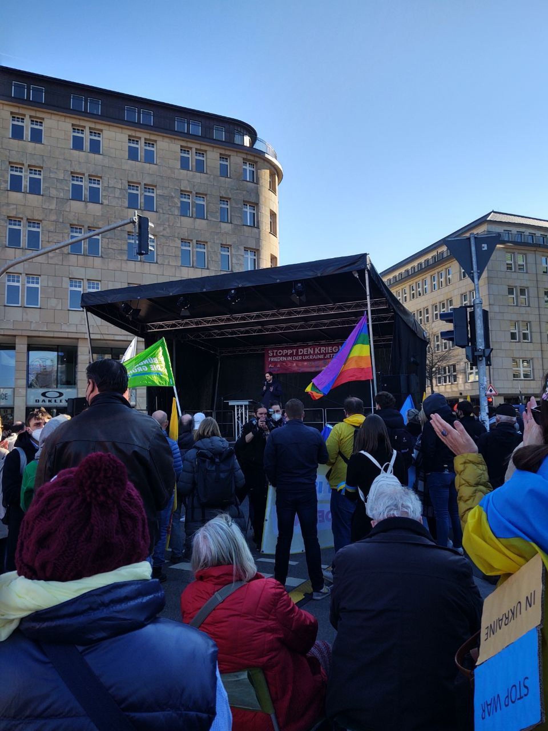 На сцені виголошували промови німецькі активісти, діячі, також були вихідці з України, які розповідали про те, як постраждала наша територія і як важко доводиться людям, що від бомб і ракетних ударів Росії помирають діти.