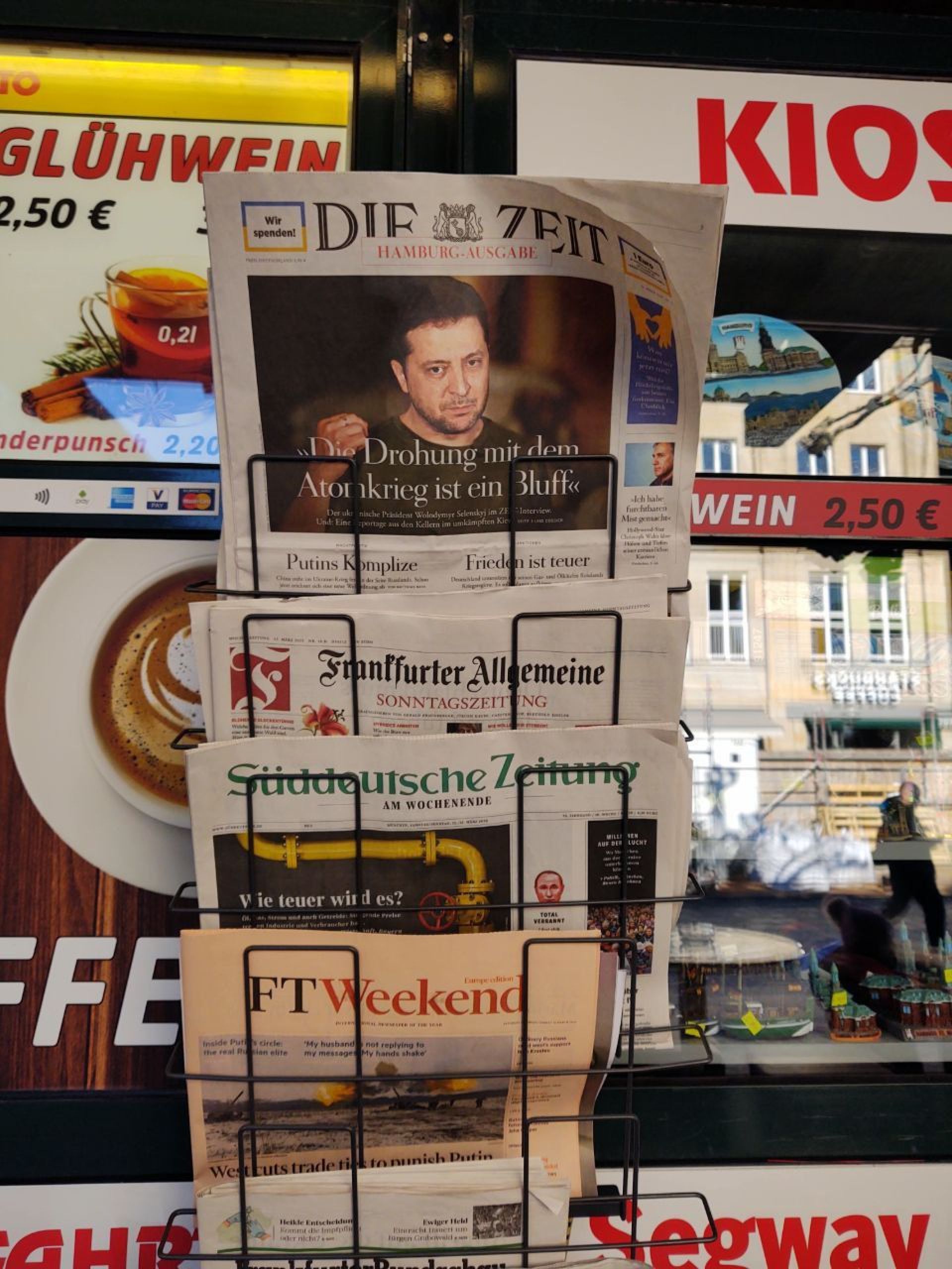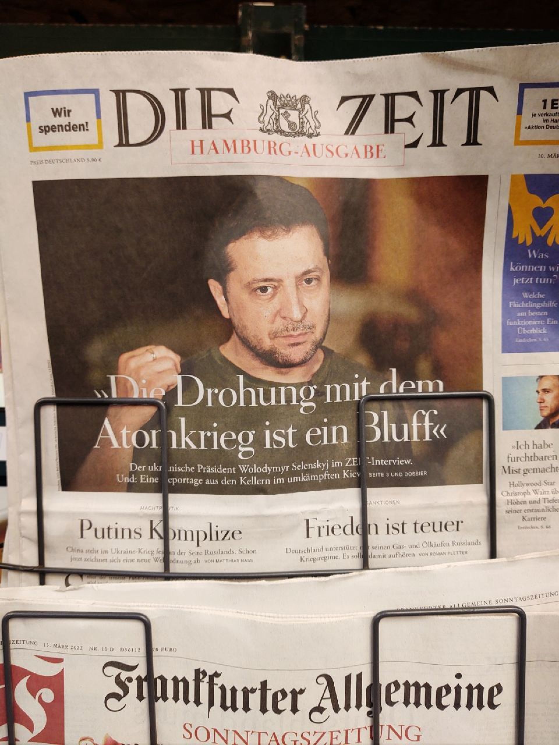 - В кіосках преси в центрі Гамбурга лежать газети зі статтями про події в Україні. Один із заголовків: «Погроза атомною війною — блеф».