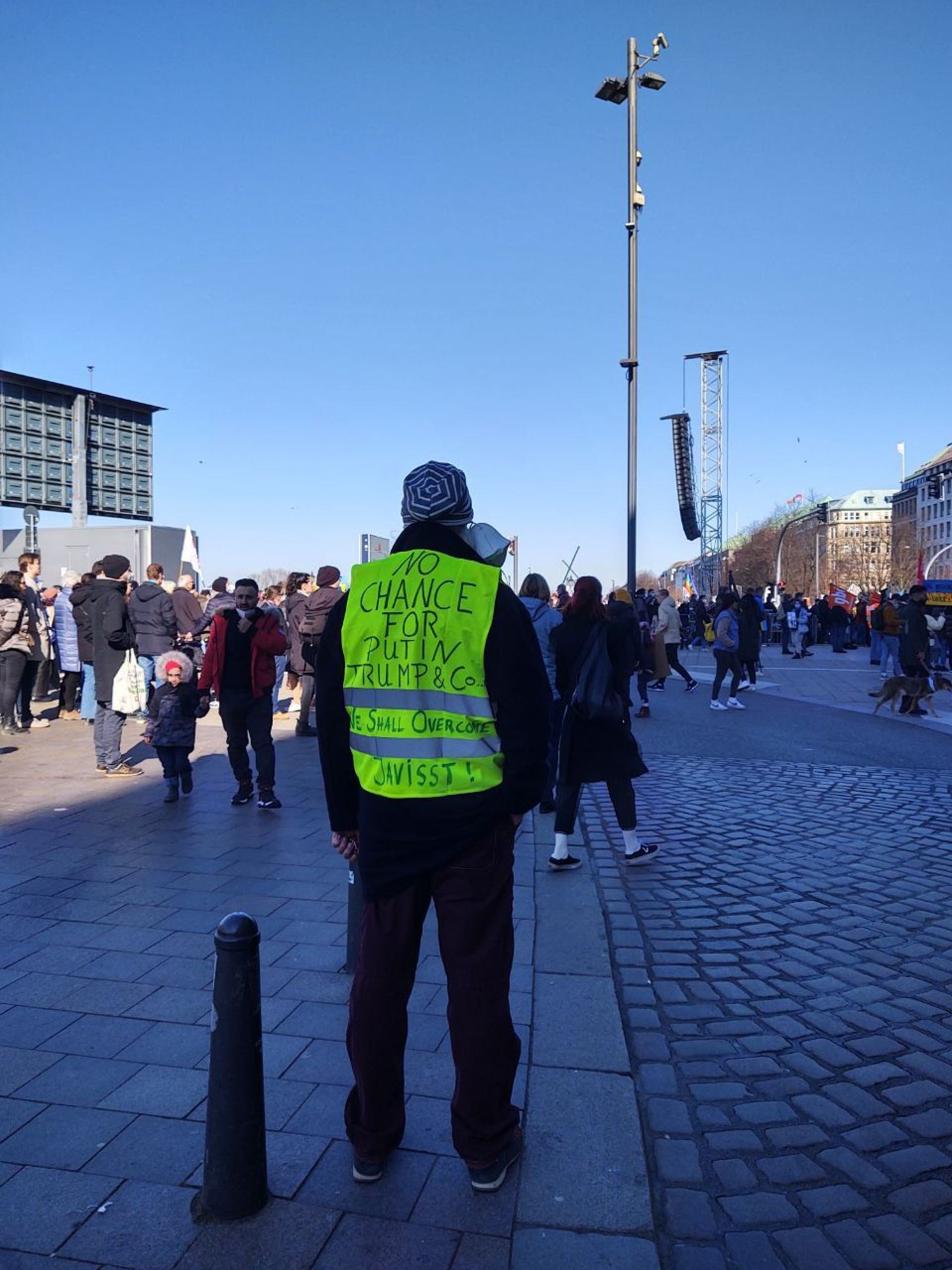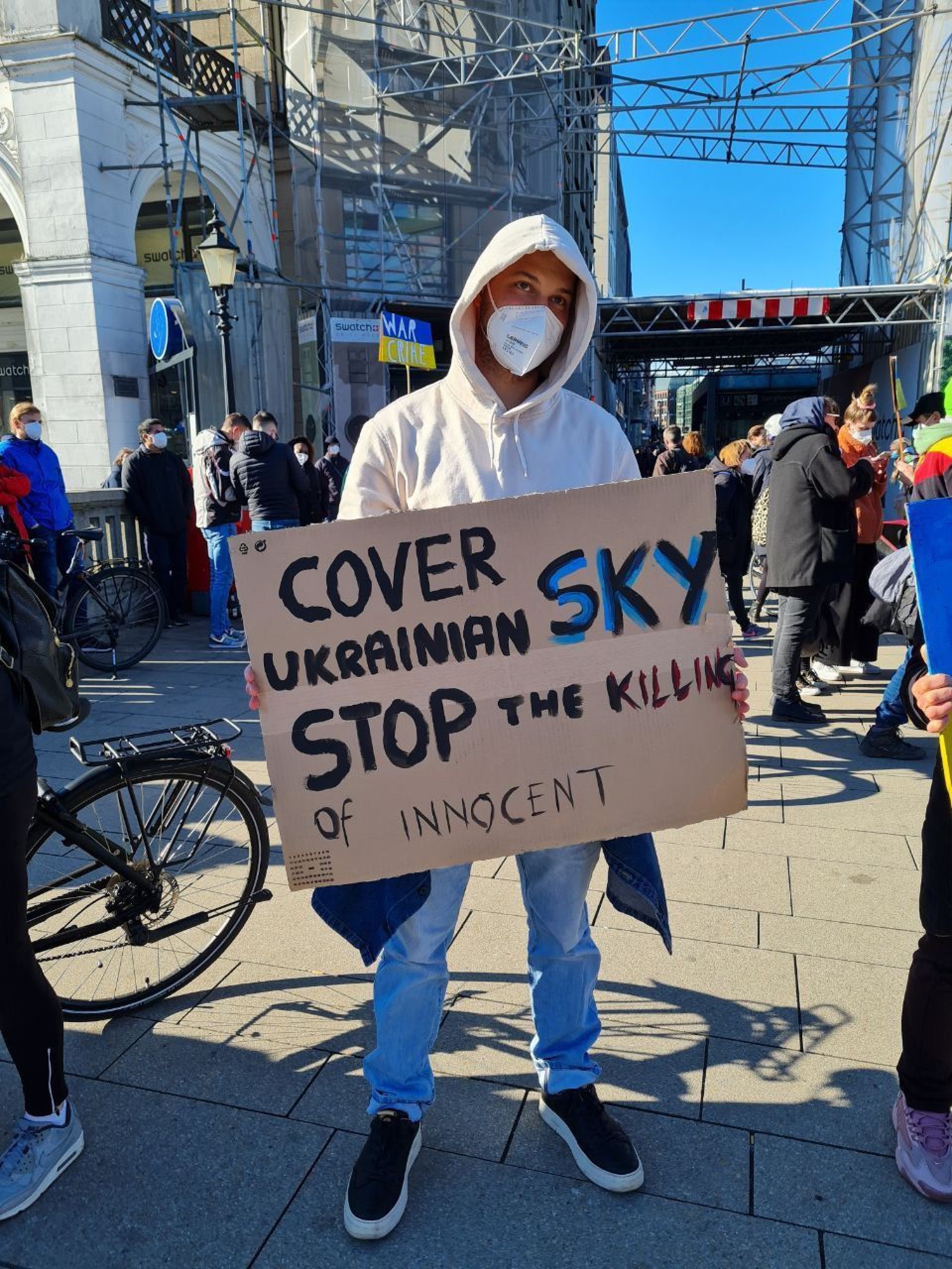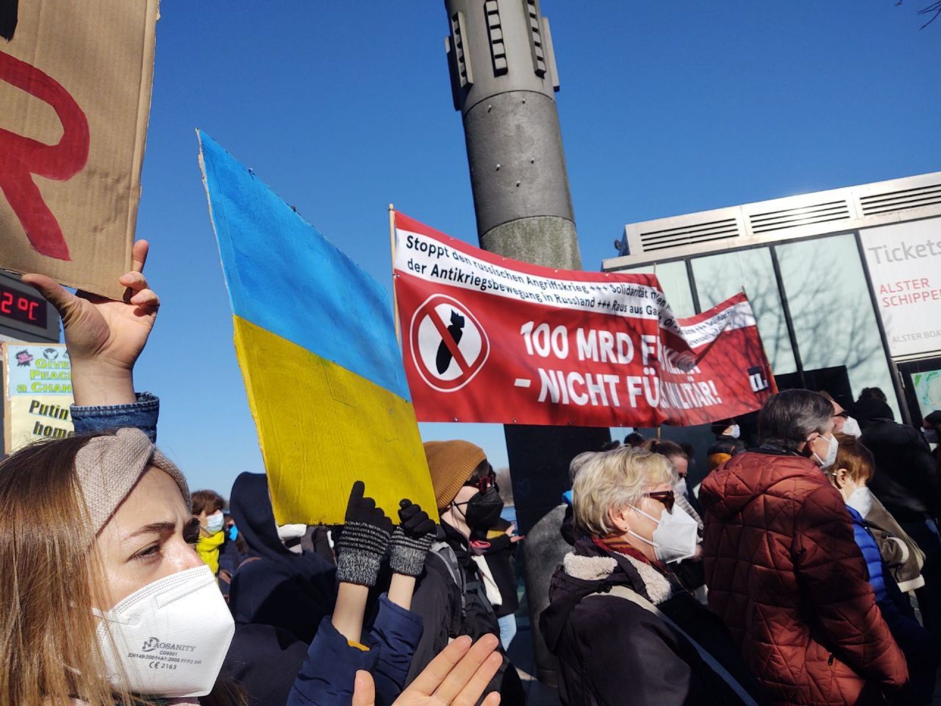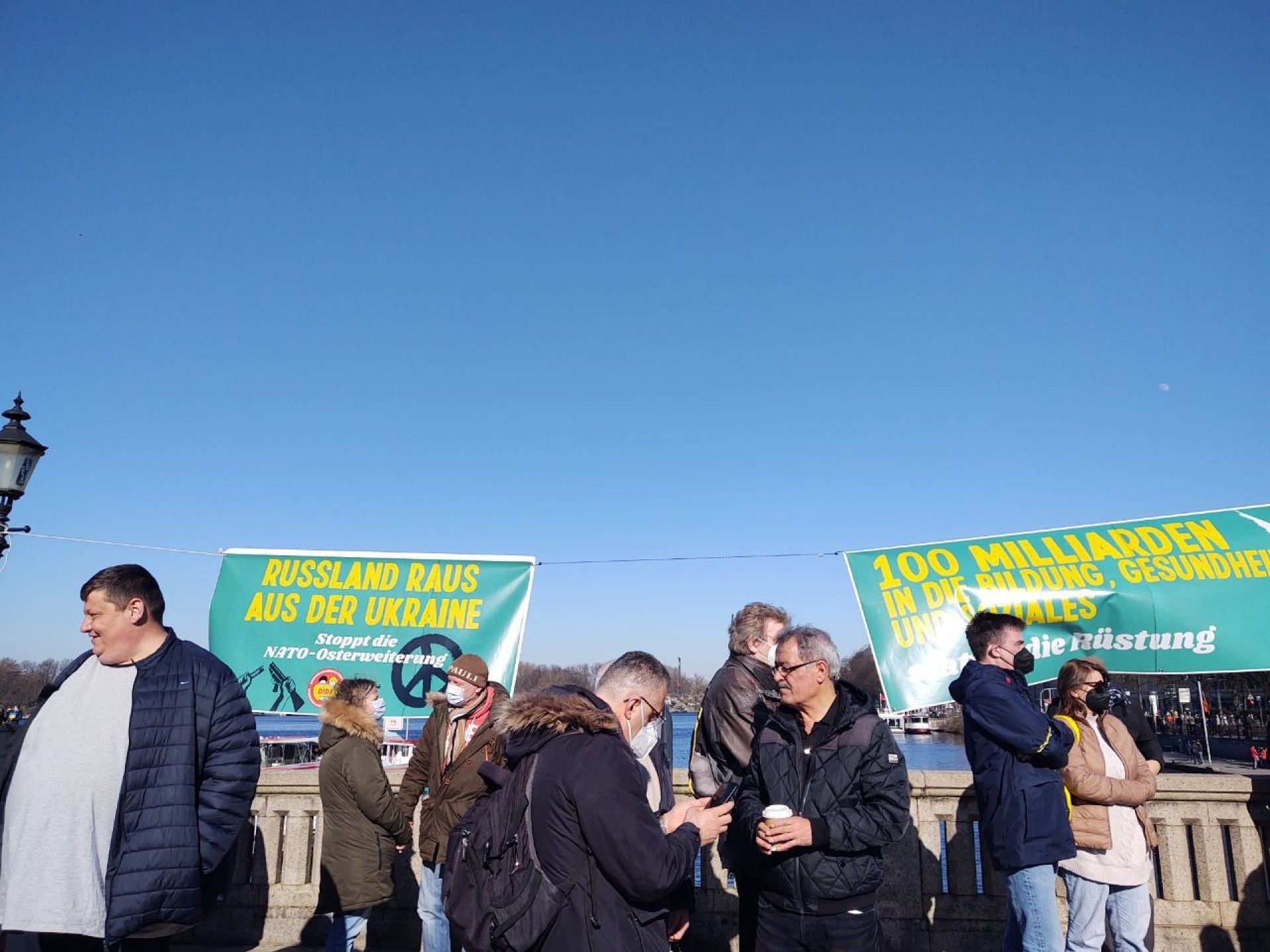 Площа Jungfernstieg заповнена, але люди продовжують надходити. Виступив демонстрант з України з вимогою того, про що просять українці: закриття повітряного простору. «Війна триває вже 17 днів, але все як раніше!» — сказав чоловік.