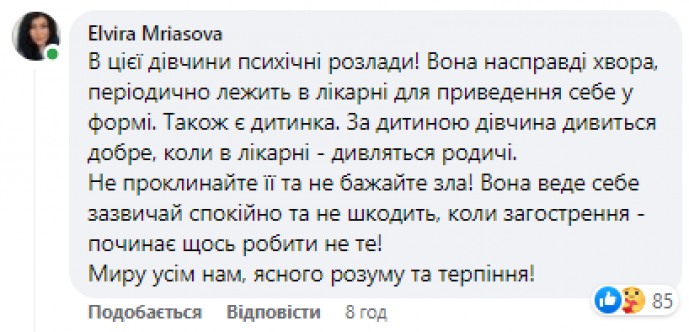 — У цієї дівчини психічні розлади! Вона насправді хвора, періодично лежить в лікарні для приведення себе у формі. Також є дитинка. За дитиною дівчина дивиться добре, коли в лікарні - дивляться родичі. Не проклинайте її та не бажайте зла! Вона веде себе зазвичай спокійно та не шкодить, коли загострення — починає щось робити не те! — пише вінничанка Elvira Mriasova.