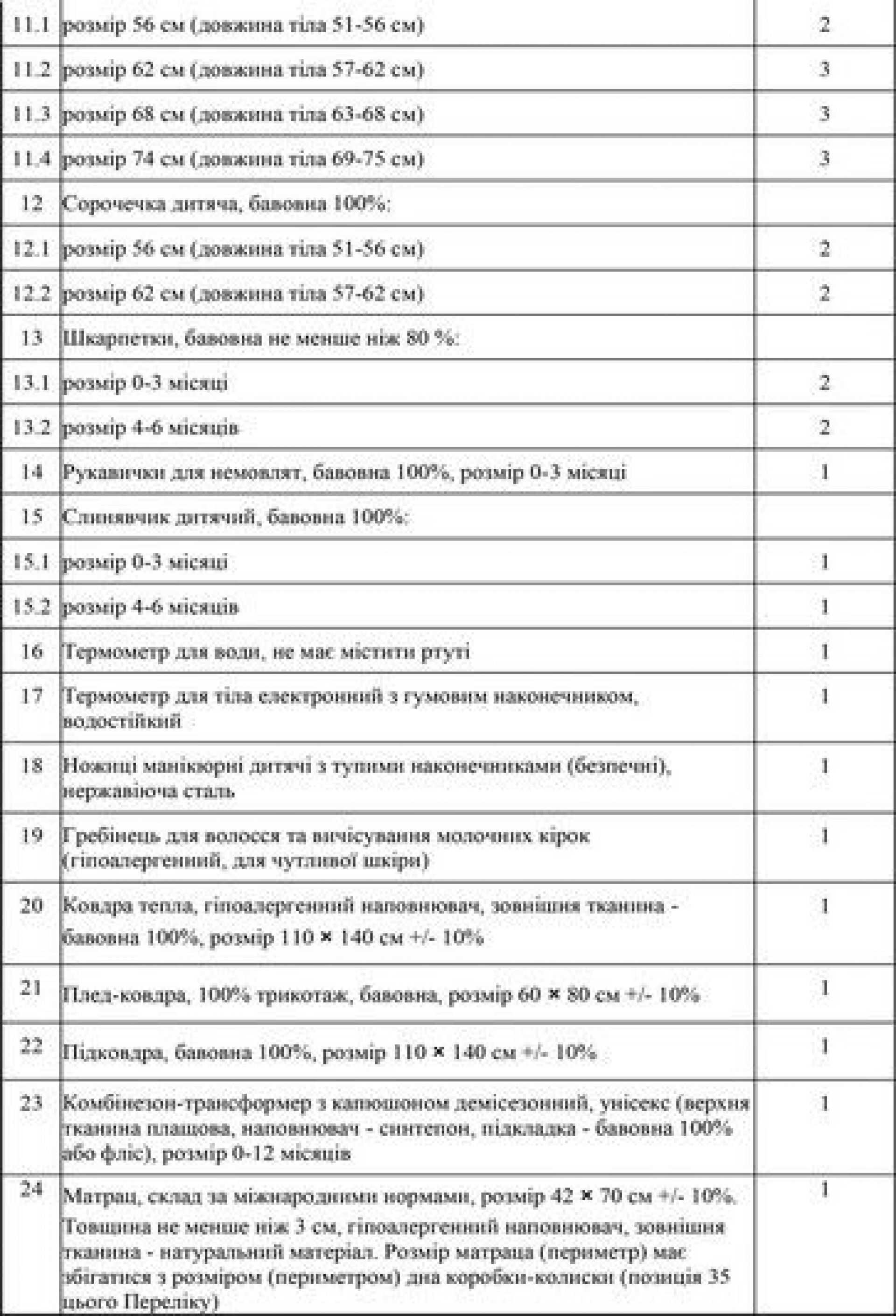 - Матрац, склад за міжнародними нормами, розмір 42 × 70 +/- 10 %. Товщина не менше ніж 3 см, гіпоалергенний наповнювач, зовнішня тканина – натуральний матеріал. Розмір матраца (периметр) має збігатися з розміром (периметром) дна коробки-колиски,